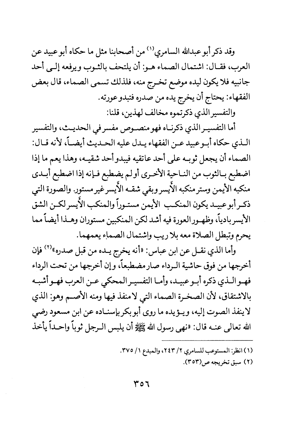 أما التفسير الذي ذكرناه فهو منصوص مفسر في الحديث والتفسير الذي حكاه أبو عبيد عن الفقهاء يدل عليه الحديث أيضا لأنه قال الصماء أن يجعل ثوبه على أحد عاتقيه فيبدو أحد شقيه وهذا يعم ما إذا اضطبع بالثوب من الناحية الأخرى أو لم يضطبع فإنه إذا اضطبع أبدى منكبه الأيمن وستر منكبه الأيسر وبقي شقه الأيسر غير مستور والصورة التي ذكر أبو عبيد يكون المنكب الأيمن مستورا والمنكب الأيسر لكن الشق الأيسر باديا وظهور العورة فيه أشد لكن المنكبين مستوران وهذا أيضا مما يحرم وتبطل الصلاة معه بلا ريب واشتمال الصماء يعمهما.