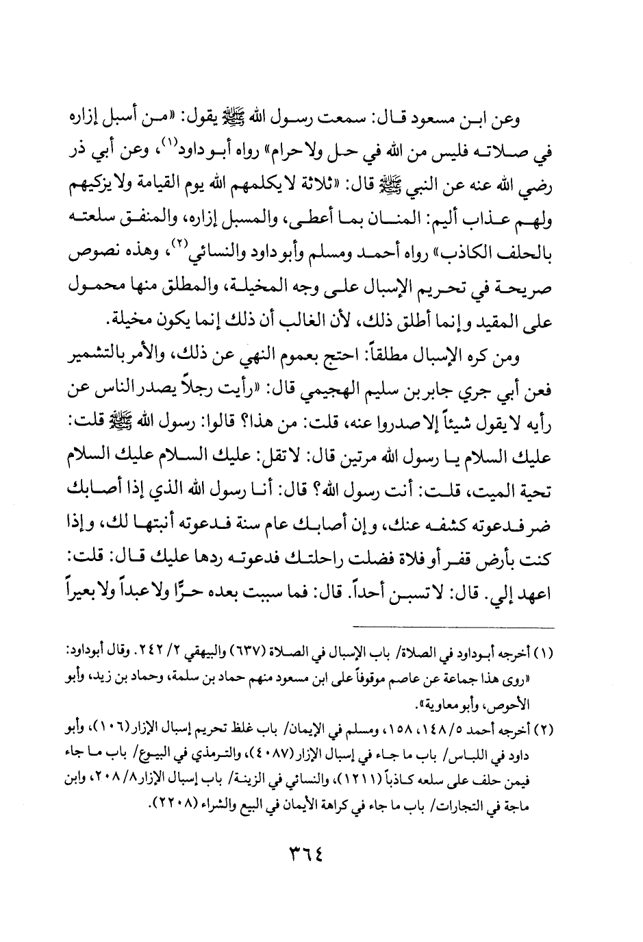 وعن ابن مسعود قال: "سمعت رسول الله صلى الله عليه وسلم يقول: "من أسبل إزاره في صلاته فليس من الله في حل ولا حرام" رواه أبو داود وعن أبي ذر رضي الله عنه عن النبي صلى الله عليه وسلم قال: "ثلاثة لا يكلمهم الله يوم القيامة ولا يزكيهم ولهم عذاب اليم المنان بما أعطى والمسبل إزاره والمنفق سلعته بالحلف الكاذب" رواه أحمد ومسلم وأبو داود والنسائي وهذه منصوص صريحة في تحريم الإسبال على وجه المخيلة والمطلق منها محمول على المقيد وإنما أطلق ذلك لأن الغالب أن ذلك إنما يكون مخيلة.