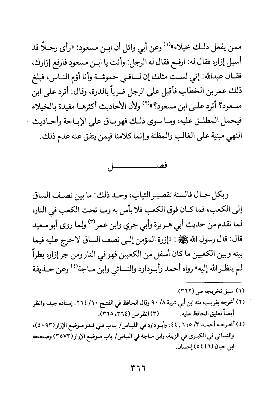 ممن يفعل ذلك خيلاء" وعن أبي وائل أن ابن مسعود رأى رجلا قد أسبل إزاره فقال له: "ارفع فقال له الرجل وأنت يا ابن مسعود فارفع إزارك فقال عبد الله إني لست مثلك أن لساقي حموشة وأنا أؤم الناس فبلغ ذلك عمر بن الخطاب فاقبل على الرجل ضربا بالدرة وقال أترد على ابن مسعود أترد على ابن مسعود ولأن الأحاديث أكثرها مقيدة بالخيلاء فيحمل المطلق عليه وما سوى ذلك فهو باق على الإباحة وأحاديث النهي مبنية على الغالب والمظنة وإنما كلامنا فيمن يتفق عنه عدم ذلك.