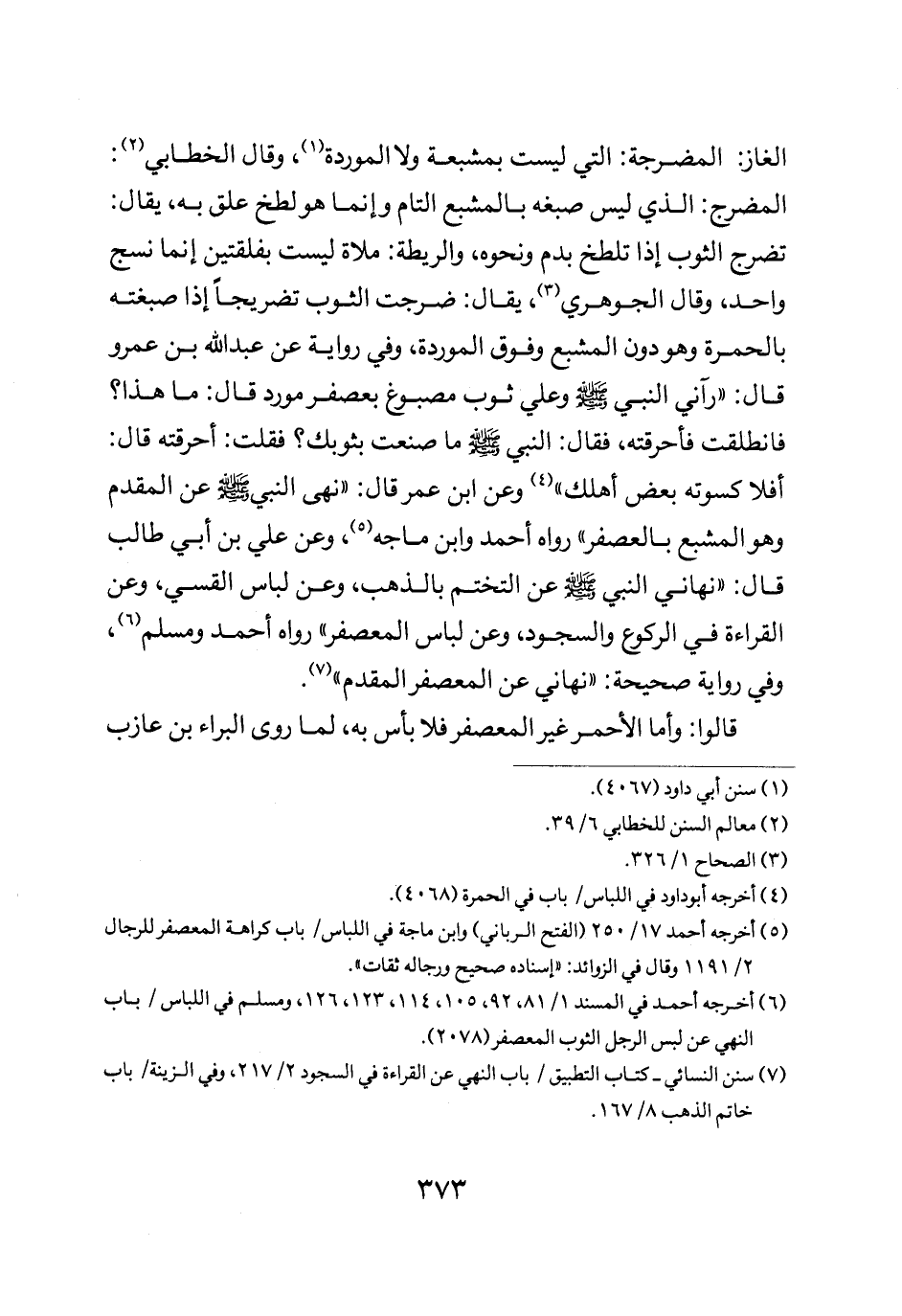 الغاز المضرجة التي ليست بمشبعة ولا الموردة وقال الخطابي المضرج الذي ليس صبغه بالمشبع التام وإنما هو لطخ عق به يقال تضرج الثوب إذا تلطخ بدم ونحوه والريطة ملاة ليست بفلقتين إنما نسج واحد وقال الجوهري يقال ضرجت الثوب تضريجا إذا صبغته بالحمرة وهو دون المشبع وفوق الموردة وفي رواية عن عبد الله بن عمرو قال: "رآني النبي صلى الله عليه وسلم وعلي ثوب مصبوغ بعصفر مورد قال: ما هذا فانطلقت فأحرقته فقال النبي صلى الله عليه وسلم: "ما صنعت بثوبك فقلت أحرقته قال أفلا كسوته بعض اهلك" وعن ابن عمر قال: "نهى النبي صلى الله عليه وسلم عن المقدم وهو المشبع بالعصفر" رواه أحمد وابن ماجة وعن علي بن أبي طالب قال: "نهاني النبي صلى الله عليه وسلم عن التختم بالذهب وعن لباس القس وعن القراءة في الركوع والسجود وعن لباس المعصفر" رواه أحمد ومسلم وفي رواية صحيحة نهاني عن المعصفر المقدم.