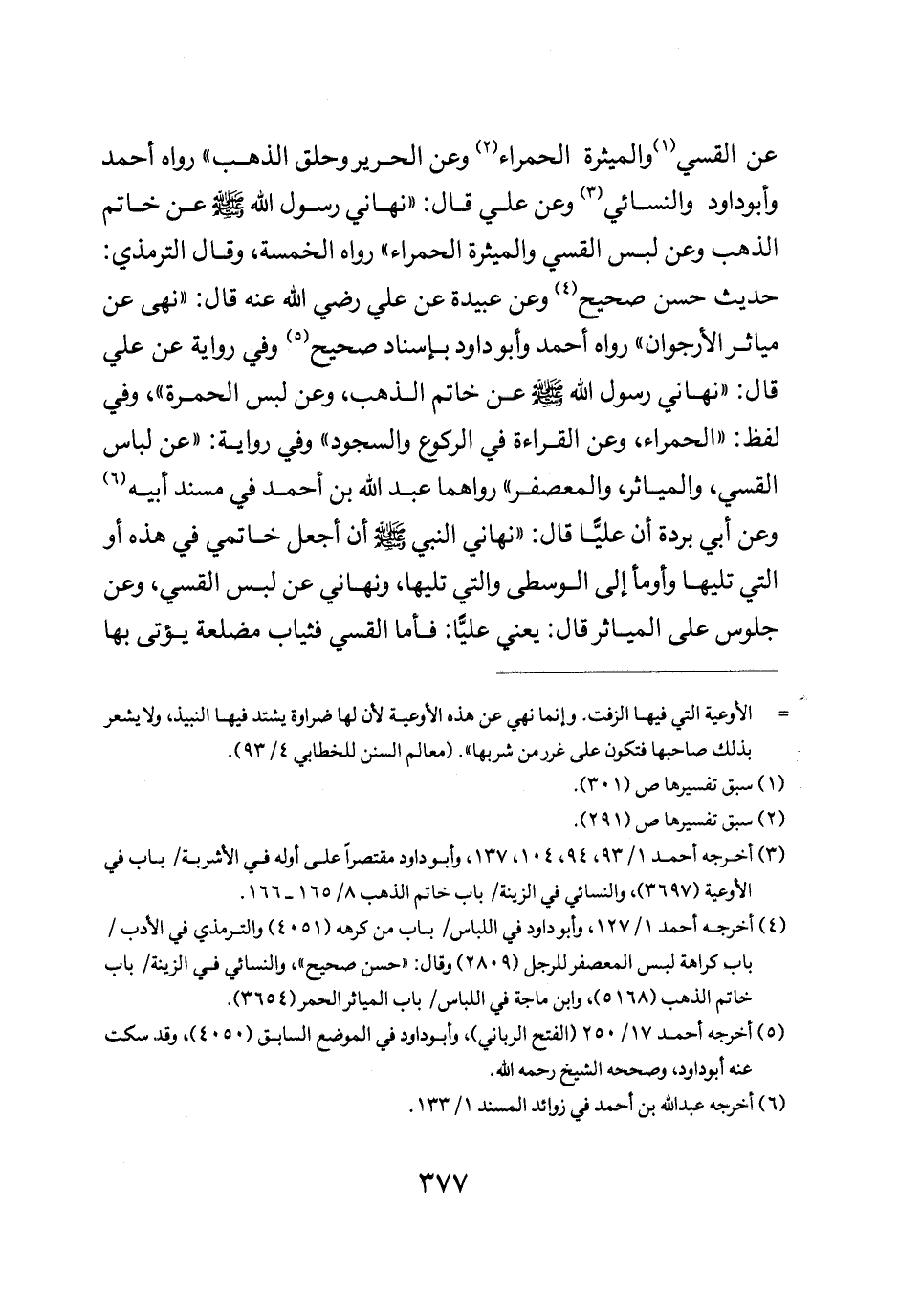 عن القسي والميثرة وعن الحرير وحلق الذهب" رواه أحمد وأبو داود والنسائي وعن علي قال: "نهاني رسول الله صلى الله عليه وسلم عن خاتم الذهب وعن لبس القسي والميثرة الحمراء" رواه الخمسة وقال الترمذي حديث حسن صحيح وعن عبيدة عن علي رضي الله عنه قال: "نهى عن مياثر الأرجوان" رواه أحمد وأبو داود بإسناد صحيح وفي رواية عن علي قال: "نهاني رسول الله صلى الله عليه وسلم عن خاتم الذهب وعن لبس الحمرة" وفي لفظ: "الحمراء وعن القراءة في الركوع والسجود" وفي رواية: "عن لباس القسي والمياثر والمعصفر" رواهما عبد الله بن أحمد في مسند أبيه وعن أبي بردة أن عليا قال: "نهاني النبي صلى الله عليه وسلم أن اجعل خاتمي في هذه أو التي تليها واوما إلى الوسطى والتي تليها ونهاني عن لبس القسي وعن جلوس على المياثر" قال يعني عليا فأما القسي فثياب مضلعة يؤتى بها