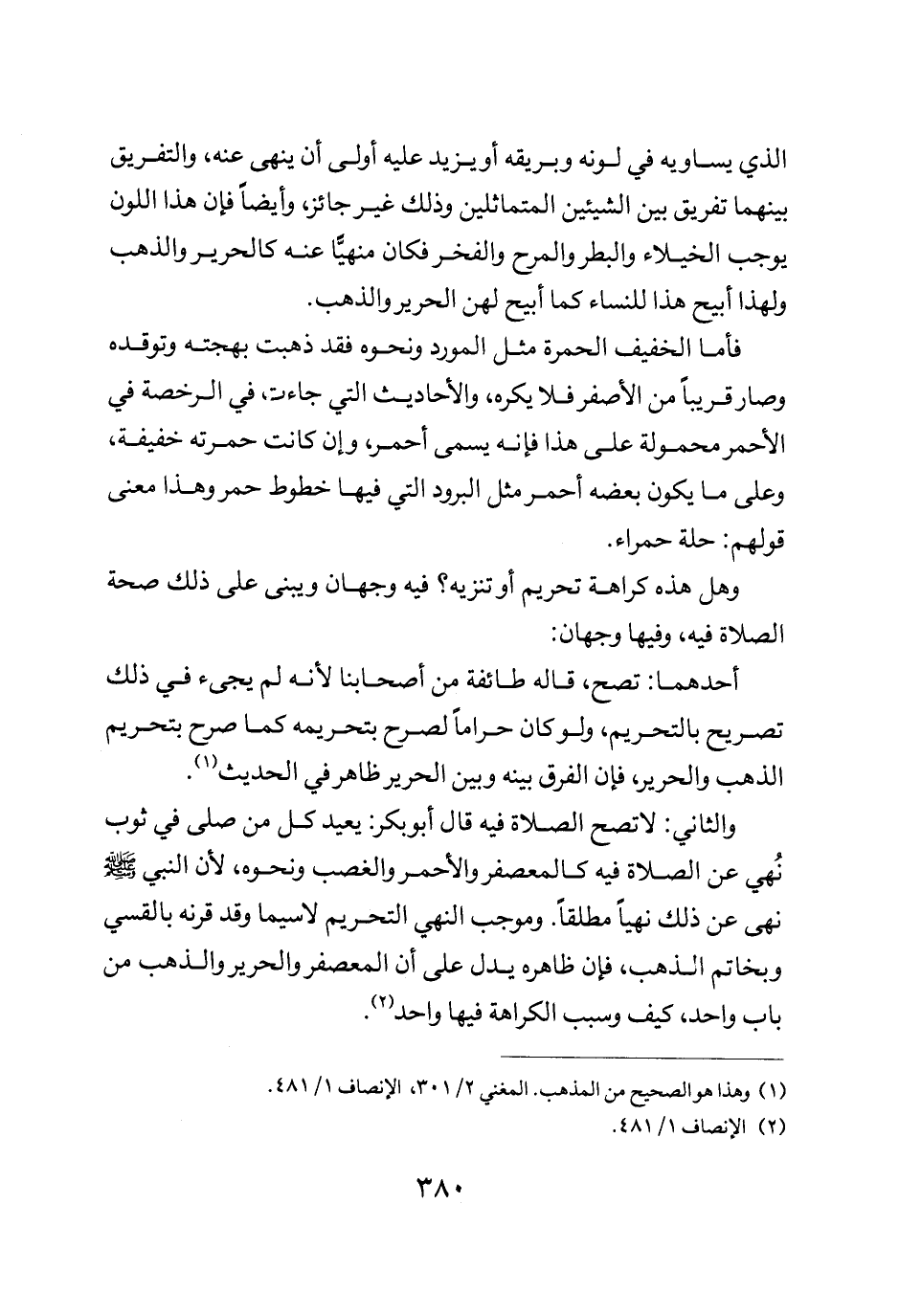 والثاني: لا تصح الصلاة فيه قال ابو بكر يعيد كل من صلى في ثوب نهي عن الصلاة فيه كالمعصفر والأحمر والغصب ونحوه لأن النبي صلى الله عليه وسلم نهى عن ذلك نهيا مطلقا وموجب النهي التحريم لا سيما وقد قرنه بالقسي وبخاتم الذهب فإن ظاهره يدل على أن المعصفر والحرير والذهب من باب واحد كيف وسبب الكراهة فيها واحد