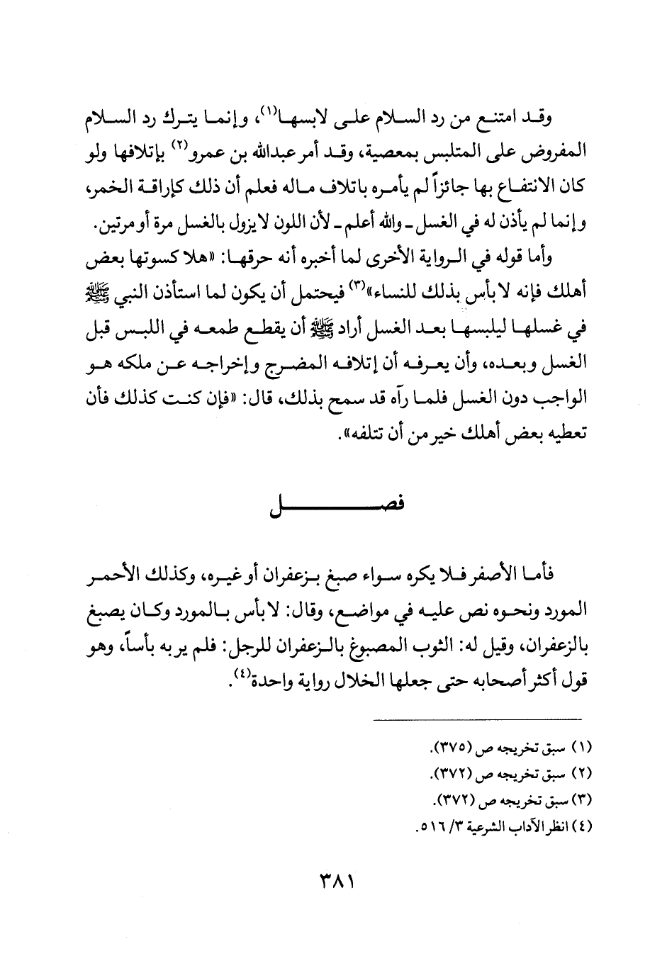 وقد امتنع من رد السلام على لابسها وإنما يترك رد السلام المفروض على المتلبس بمعصية وقد أمر عبد الله بن عمرو باتلافها ولو كان الانتفاع بها جائزا لم يامره باتلاف ماله فعلم أن ذلك كاراقة الخمر وإنما لم ياذن له في الغسل والله أعلم لأن اللون لا يزول بالغسل مرة أو مرتين.