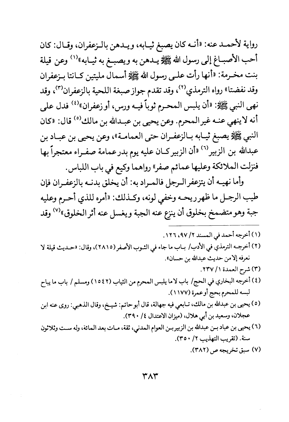 رواية لأحمد عنه أنه كان يصبغ ثيابه ويدهن بالزعفران وقال كان أحب الإصباغ إلى رسول الله صلى الله عليه وسلم يدهن به ويصبغ به ثيابه وعن قيلة بنت مخرمة: "أنها رأت رسول الله صلى الله عليه وسلم اسمال مليتين كانتا بزعفران وقد نفضتا" رواه الترمذي وقد تقدم جواز صبغة اللحية بالزعفران وقد نهى النبي صلى الله عليه وسلم: "أن يلبس المحرم ثوبا فيه ورس أو زعفران" فدل على أنه لا ينهى عنه غير المحرم وعن يحيى بن عبد الله بن مالك قال: "كان النبي صلى الله عليه وسلم يصبغ ثيابه بالزعفران حتى العمامة" وعن يحيى بن عباد بن عبد الله بن الزبير أن الزبير كان عليه يوم بدر عمامة صفراء معتجرا بها فنزلت الملائكة وعليها عمائم صفر" رواهما وكيع في باب اللباس.