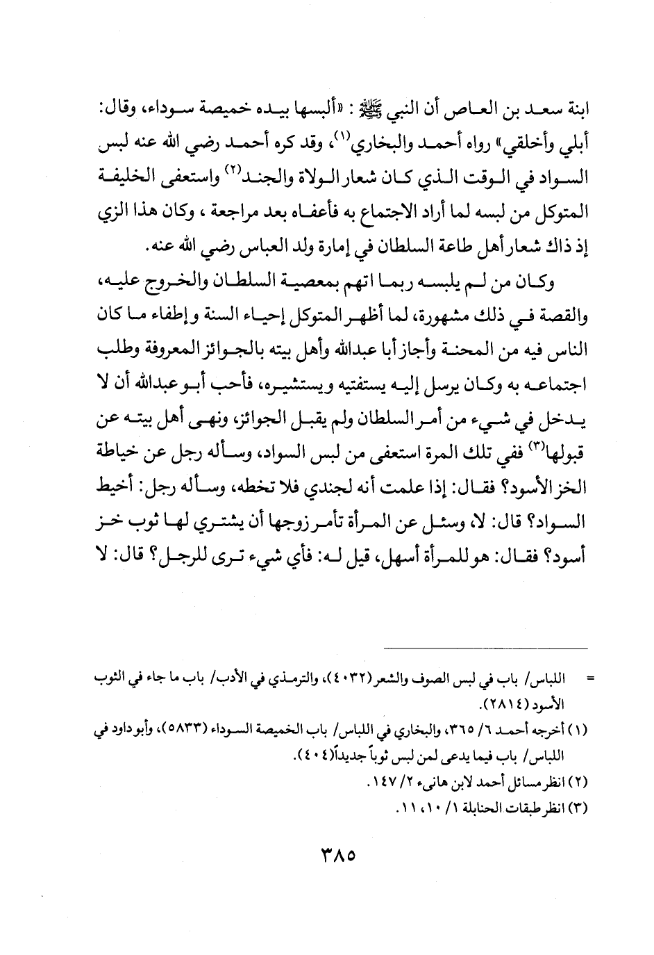ابنة سعد بن العاص: "أن النبي صلى الله عليه وسلم البسها بيده خميصة سوداء وقال: "أبلى واخلقي" رواه أحمد والبخاري وقد كره أحمد رضي الله عنه لبس السواد في الوقت الذي كان شعار الولاة والجند واستعفى الخليفة المتوكل من لبسه لما أراد الاجتماع به فأعفاه بعد مراجعة وكان هذا الزي إذ ذاك شعار أهل طاعة السلطان في أمارة ولد العباس رضي الله عنه.