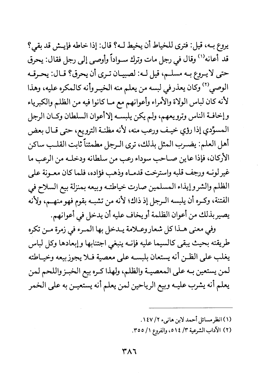 يروع به قيل فترى للخياط أن يخيط له قال إذا خاطه فايش قد بقي قد أعانه وقال في رجل مات وترك سوادا وأوصى إلى رجل فقال يحرق حتى لا يروع به مسلم قيل له لصبيان ترى أن يحرق قال يحرقه الوصي وكان يعذر في لبسه من يعلم منه الخير وأنه كالمكره عليه وهذا لأنه كان لباس الولاة والأمراء وأعوانهم مع ما كانوا فيه من الظلم والكبرياء وأخافة الناس وترويعهم ولم يكن يلبسه إلا أعوان السلطان وكان الرجل المسودي إذا رؤي خيف ورعب منه لأنه مظنة الترويع حتى قال بعض أهل العلم يضرب المثل بذلك ترى الرجل مطمئنا ثابت القلب ساكن الأركان فإذا عاين صاحب سواد رعب من سلطانه ودخله من الرعب ما غير لونه ورجف قلبه واسترخت قدماه وذهب فؤاده فلما كان معونة على الظلم والشر وإيذاء المسلمين صارت خياطته وبيعه بمنزلة بيع السلاح في الفتنة وكره أن يلبسه الرجل إذ ذاك لأنه من تشبه بقوم فهو منهم ولأنه يصير بذلك من أعوان الظلمة أو يخاف عليه أن يدخل في أعوانهم.