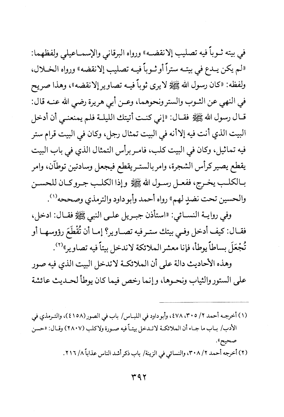في بيته ثوبا فيه تصليب إلا نقضه" ورواه البرقاني والإسماعيلي ولفظهما: "لم يكن يدع في بيته سترا أو ثوبا فيه تصاوير إلا نقضه" ورواه الخلال ولفظه: "كان رسول الله صلى الله عليه وسلم لا يرى ثوبا فيه تصاوير إلا نقضه" وهذا صريح في النهي عن الثوب والستر ونحوهما وعن أبي هريرة رضي الله عنه قال قال رسول الله صلى الله عليه وسلم: "فقال إني كنت أتيتك الليلة فلم يمنعني أن ادخل البيت الذي أنت فيه إلا أنه في البيت تمثال رجل وكان في البيت قرام ستر فيه تماثيل وكان في البيت كلب فأمر برأس التمثال الذي في باب البيت يقطع يصير كراس شجرة وأمر بالستر يقطع فيجعل وسادتين توطان وأمر بالكلب يخرج ففعل رسول الله صلى الله عليه وسلم وإذا الكلب جرو كان للحسن والحسين تحت نضد لهم" رواه أحمد وأبو داود والترمذي وصححه.