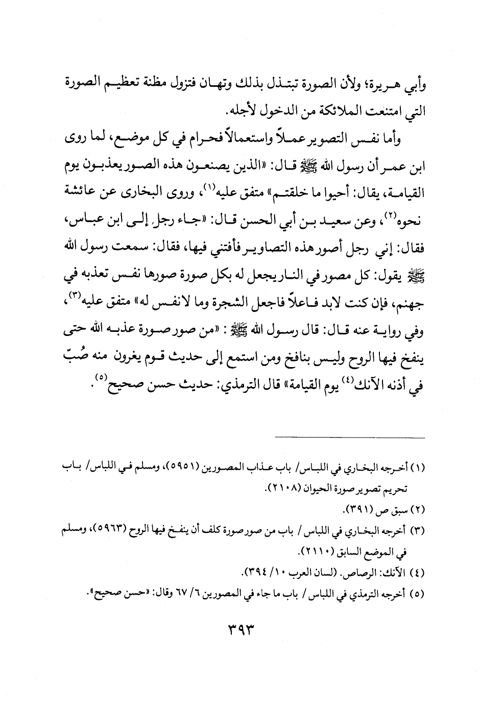 وأما نفس التصوير عملا واستعمالا فحرام في كل موضع لما روى ابن عمر أن رسول الله صلى الله عليه وسلم قال: "الذين يصنعون هذه الصور يعذبون يوم القيامة يقال احيوا ما خلقتم" متفق عليه وروى البخاري عن عائشة نحوه وعن سعيد بن أبي الحسن قال: "جاء رجل إلى ابن عباس فقال إني رجل أصور هذه التصاوير فافتني فيها فقال سمعت رسول الله صلى الله عليه وسلم يقول: "كل مصور في النار يجعل له بكل صورة صورها نفس تعذبه في جهنم" فإن كنت لا بد فاعلا فاجعل الشجرة وما لا نفس له" متفق عليه وفي رواية عنه قال قال رسول الله صلى الله عليه وسلم: "من صور صورة عذبه الله حتى ينفخ فيها الروح وليس بنافخ ومن استمع إلى حديث قوم يغرون منه صب في أذنه الانك يوم القيامة" قال الترمذي حديث حسن صحيح.