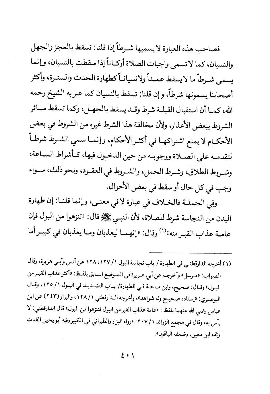 وفي الجملة فالخلاف في عبارة لا في معنى وإنما قلنا أن طهارة البدن من النجاسة شرط للصلاة لأن النبي صلى الله عليه وسلم قال: "تنزهوا من البول فإن عامة عذاب القبر منه" وقال: "إنهما ليعذبان وما يعذبان في كبير أما