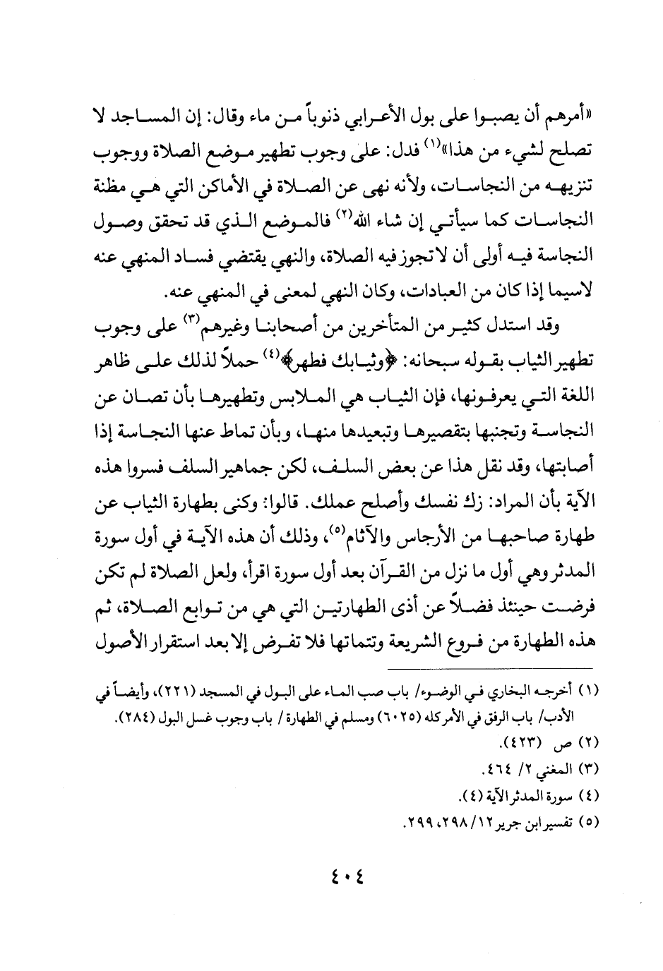 وقد استدل كثير من المتأخرين من أصحابنا وغيرهم على وجوب تطهير الثياب بقوله سبحانه: {وَثِيَابَكَ فَطَهِّرْ} حملا لذلك على ظاهر اللغة التي يعرفونها فإن الثياب هي الملابس وتطهيرها بان تصان عن النجاسة وتجنبها بتقصيرها وتبعيدها منها وبان تماط عنها النجاسة إذا إصابتها وقد نقل هذا عن بعض السلف لكن جماهير السلف فسروا هذه الآية بأن المراد زك نفسك وأصلح عملك قالوا وكنى بطهارة الثياب عن طهارة صاحبها من الأرجاس والاثام وذلك أن هذه الآية في أول سورة المدثر وهي أول ما نزل من القران بعد أول سورة اقرأ ولعل الصلاة لم تكن فرضت حينئذ فضلا عن اذى الطهارتين التي هي من توابع الصلاة ثم هذه الطهارة من فروع الشريعة وتتماتها فلا تفرض إلا بعد استقرار الأصول
