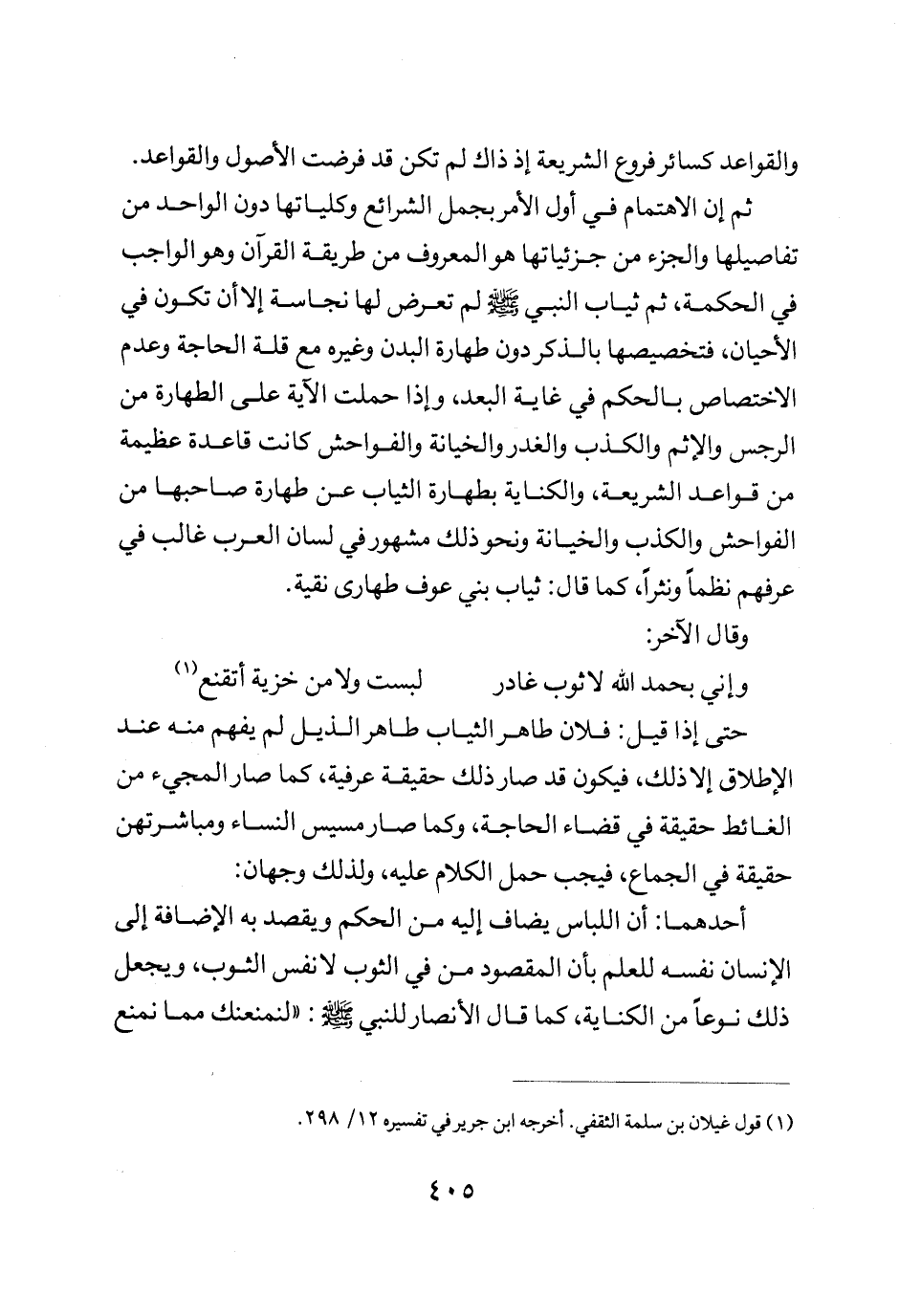 ثم أن الاهتمام في أول الأمر بجمل الشرائع وكلياتها دون الواحد من تفاصيلها والجزء من جزئياتها هو المعروف من طريقة القران وهو الواجب في الحكمة ثم ثياب النبي صلى الله عليه وسلم لم تعرض لها نجاسة إلا أن تكون في الأحيان فتخصيصها بالذكر دون طهارة البدن وغيره مع قلة الحاجة وعدم الاختصاص بالحكم في غاية البعد وإذا حملت الآية على الطهارة من الرجس والاثم والكذب والغدر والخيانة والفواحش كانت قاعدة عظيمة من قواعد الشريعة والكناية بطهارة الثياب عن طهارة صاحبها من الفواحش والكذب والخيانة ونحو ذلك مشهور في لسان العرب غالب في عرفهم نظما ونثرا كما قال.