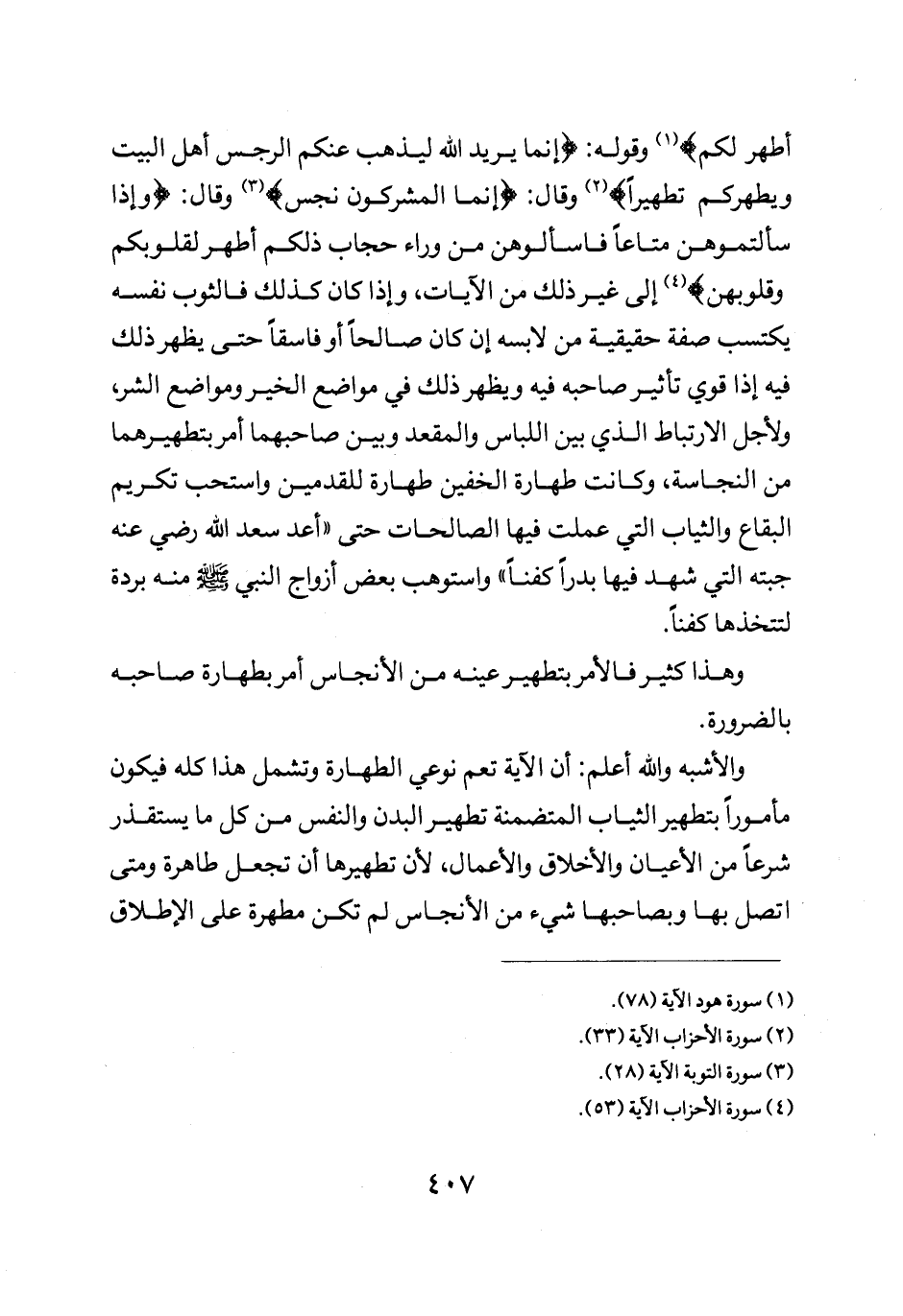 أَطْهَرُ لَكُمْ} وقوله: {إِنَّمَا يُرِيدُ اللَّهُ لِيُذْهِبَ عَنْكُمُ الرِّجْسَ أهل الْبَيْتِ وَيُطَهِّرَكُمْ تَطْهِيراً} وقال: {إنما المشركون نجس} وقال: {وَإِذَا سَأَلْتُمُوهُنَّ مَتَاعاً فَاسْأَلوهُنَّ مِنْ وَرَاءِ حِجَابٍ ذَلِكُمْ أَطْهَرُ لِقُلُوبِكُمْ وَقُلُوبِهِنَّ} إلى غير ذلك من الآيات وإذا كان كذلك فالثوب نفسه يكتسب صفة حقيقية من لابسه أن كان صالحا أو فاسقا حتى يظهر ذلك فيه إذا قوي تاثير صاحبه فيه ويظهر ذلك في مواضع الخير ومواضع الشر ولاجل الارتباط الذي بين اللباس والمقعد وبين صاحبهما أمر بتطهيرهما من النجاسة وكانت طهارة الخفين طهارة للقدمين واستحب تكريم البقاع والثياب التي عملت فيها الصالحات حتى اعد سعد رضي الله عنه جبته التي شهد فيها بدرا كفنا واستوهب بعض أزواج النبي صلى الله عليه وسلم منه بردة لتتخذها كفنا.