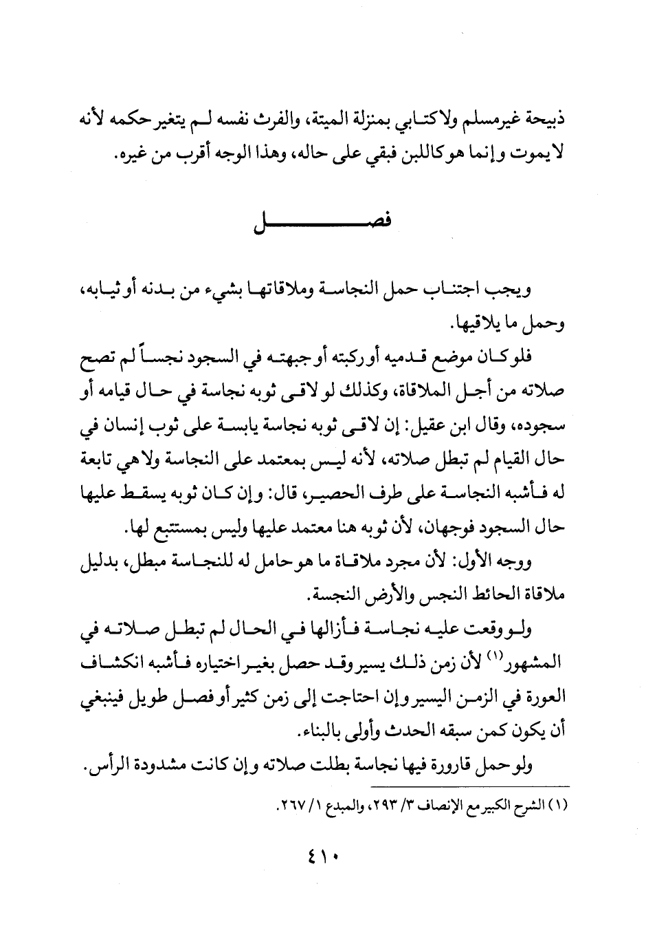 فلو كان موضع قدميه أو ركبته أو جبهته في السجود نجسا لم تصح صلاته من أجل الملاقاة وكذلك لو لاقى ثوبه نجاسة في حال قيامه أو سجوده وقال ابن عقيل أن لاقى ثوبه نجاسة يابسة على ثوب انسان في حال القيام لم تبطل صلاته لأنه ليس بمعتمد على النجاسة ولا هي تابعة له فاشبه النجاسة على طرف الحصير قال وأن كان ثوبه يسقط عليها حال السجود فوجهان لأن ثوبه هنا معتمد عليها وليس بمستتبع لها.