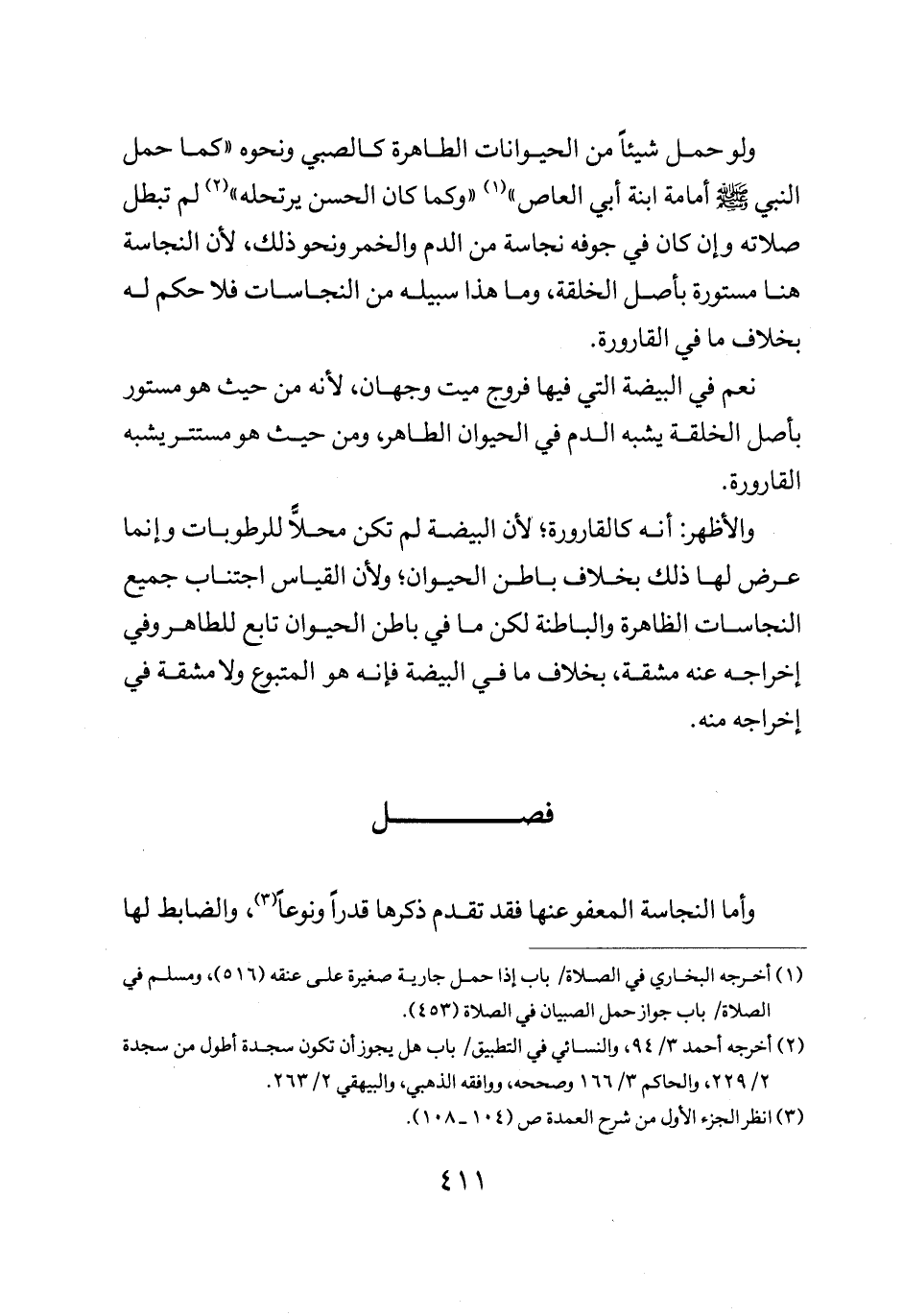 ولو حمل شيئا من الحيونات الطاهرة كالصبي ونحوه كما حمل النبي صلى الله عليه وسلم امامة ابنة أبي العاص وكما كان الحسن يرتحله لم تبطل صلاته وأن كان في جوفه نجاسة من الدم والخمر ونحو ذلك لأن النجاسة هنا مستورة بأصل الخلقة وما هذا سبيله من النجاسات فلا حكم له بخلاف ما في القارورة.