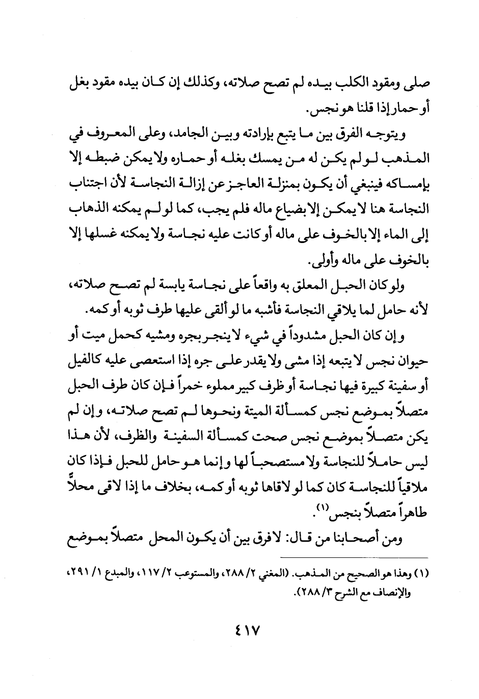 وان كان الحبل مشدودا في شيء لا ينجر بجره ومشيه كحمل ميت أو حيوان نجس لا يتبعه إذا مشى ولا يقدر على جره إذا استعصى عليه كالفيل أو سفينة كبيرة فيها نجاسة أو ظرف كبير مملوء خمرا فإن كان طرف الحبل متصلا بموضع نجس كمسألة الميتة ونحوها لم تصح صلاته وأن لم يكن متصلا بموضع نجس صحت كمسألة السفينة والظرف لأن هذا ليس حاملا للنجاسة ولا مستصحبا لها وإنما هو حامل للحبل فإذا كان ملاقيا للنجاسة كان كما لو لاقاها ثوبه أو كمه بخلاف ما إذا لاقى محلا طاهرا متصلا بنجس.