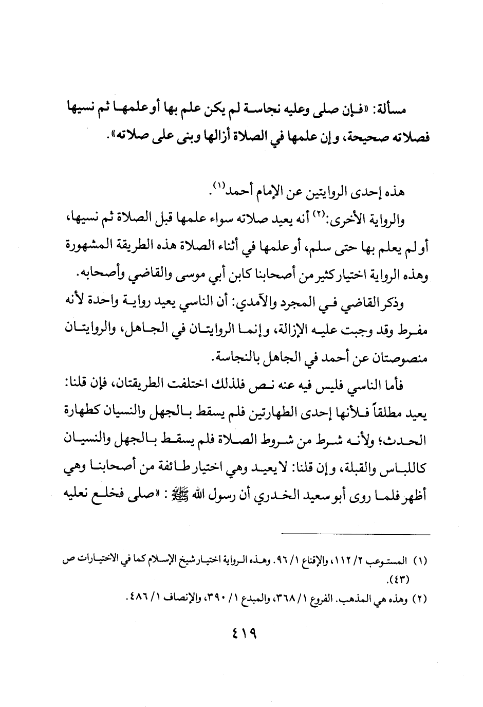 والرواية الأخرى أنه يعيد صلاته سواء علمها قبل الصلاة ثم نسيها أو لم يعلم بها حتى سلم أو علمها في اثناء الصلاة هذه الطريقة المشهورة وهذه الرواية اختيار كثير من أصحابنا كابن أبي موسى والقاضي وأصحابه.