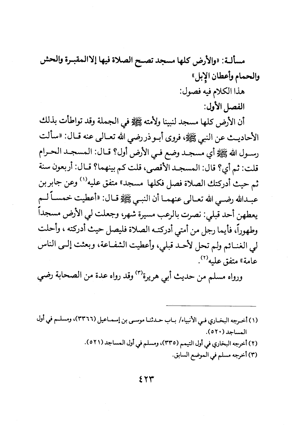 أن الأرض كلها مسجد لنبينا ولامته صلى الله عليه وسلم في الجملة وقد تواطات بذلك الأحاديث عن النبي صلى الله عليه وسلم فروى أبو ذر رضي الله عنه قال: "سألت رسول الله صلى الله عليه وسلم أي مسجد وضع في الأرض أول قال: "المسجد الحرام قلت: ثم أي قال: المسجد الاقصى قلت: كم بينهما قال: أربعون سنة ثم حيث أدركتك الصلاة فصل فكلها مسجد" متفق عليه وعن جابر بن عبد الله رضي الله عنهما قال أن النبي صلى الله عليه وسلم قال: "أعطيت خمسا لم يعطهن أحد قبلي نصرت بالرعب مسيرة شهر وجعلت لي الأرض مسجدا وطهورا فأيما رجل من أمتي أدركته الصلاة فليصل حيث أدركته وأحلت لي الغنائم ولم تحل لأحد قبلي وأعطيت الشفاعة وبعثت إلى الناس كافة" متفق عليه.