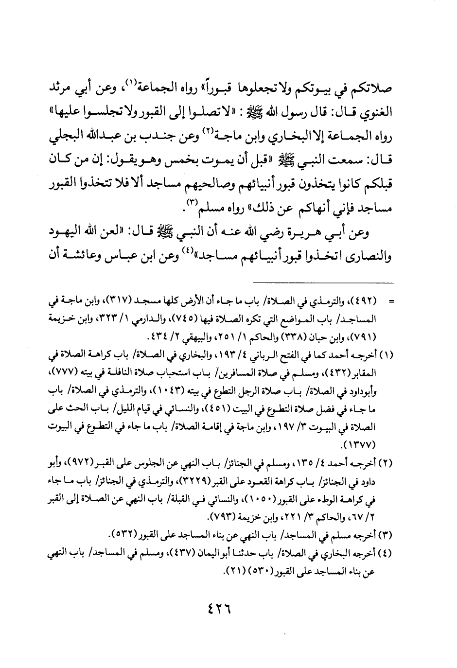صلاتكم في بيوتكم ولا تجعلوها قبورا" رواه الجماعة وعن أبي مرثد الغنوي قال قال رسول الله صلى الله عليه وسلم: "لا تصلوا إلى القبور ولا تجلسوا عليها" رواه الجماعة إلا البخاري وابن ماجه وعن جندب بن عبد الله البجلي قال سمعت النبي صلى الله عليه وسلم قبل أن يموت بخمس وهو يقول: " إن من كان قبلكم كانوا يتخذون قبور أنبيائهم وصالحيهم مساجد ألا فلا تتخذوا القبور مساجد فإني أنهاكم عن ذلك" رواه مسلم.