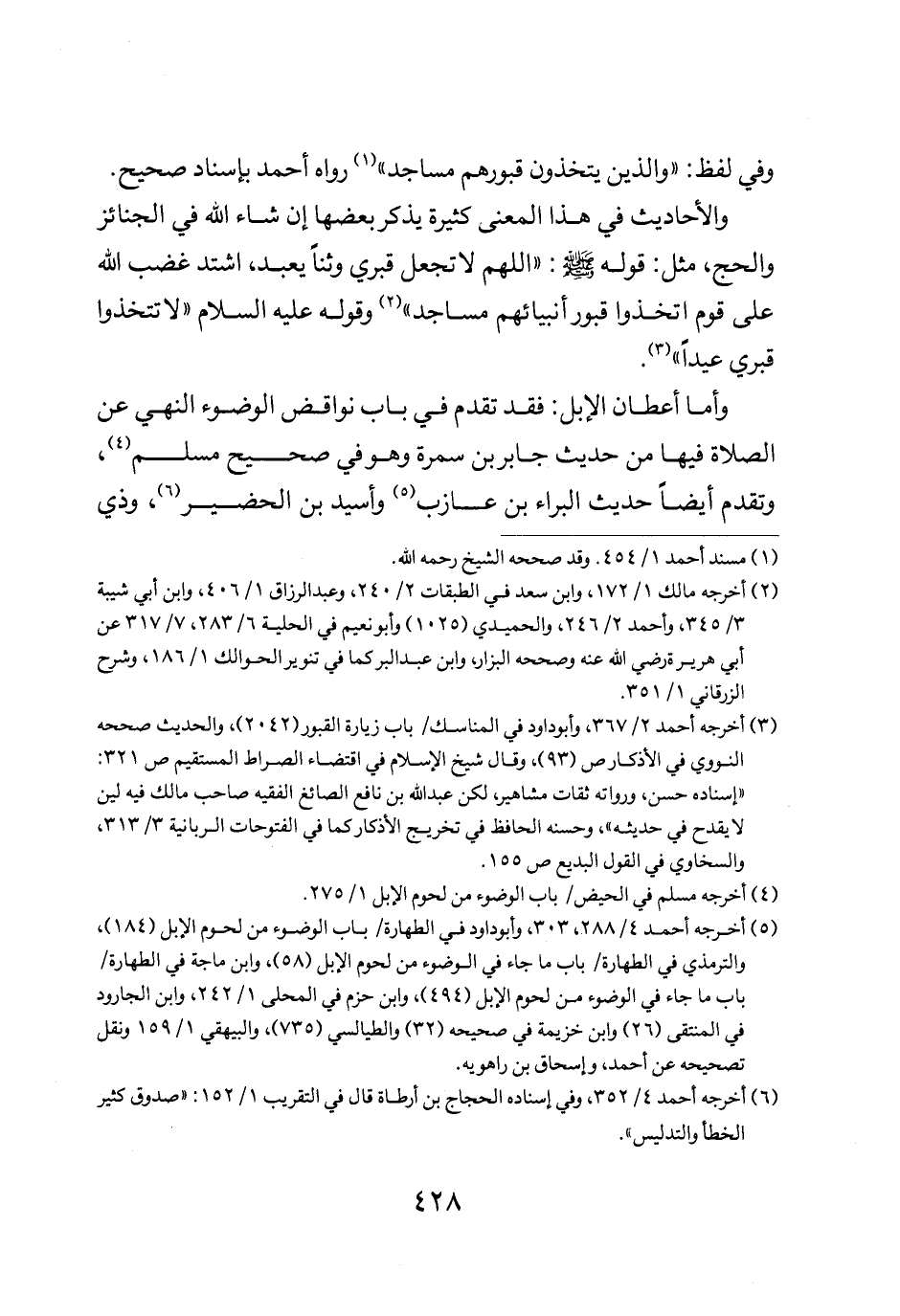 والأحاديث في هذ المعنى كثيرة يذكر بعضها أن شاء الله في الجنائز والحج مثل قوله صلى الله عليه وسلم: "اللهم لا تجعل قبري وثنا يعبد اشتد غضب الله على قوم اتخذوا قبور انبيائهم مساجد" وقوله عليه السلام: "لا تتخذوا قبري عيد"ا.
