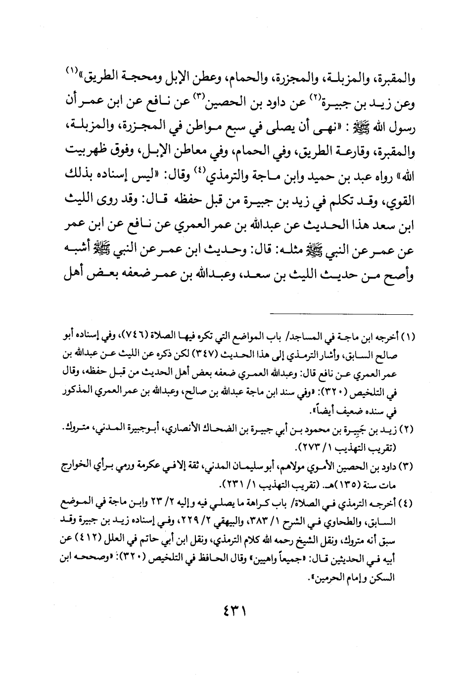 والمقبرة والمزبلة والمجزرة والحمام وعطن الإبل ومحجة الطريق" وعن زيد بن جبيرة عن داود بن الحصين عن نافع عن ابن عمر أن رسول الله صلى الله عليه وسلم: "نهى أن يصلى في سبع مواطن في المجزرة والمزبلة والمقبرة وقارعة الطريق وفي الحمام وفي معاطن الإبل وفوق ظهر بيت الله" رواه عبد بن حميد وابن ماجة والترمذي وقال ليس اسناده بذلك القوي وقد تكلم في زيد بن جبيرة من حفظه قال وقد روى الليث ابن سعد هذا الحديث عن عبد الله بن عمر العمري عن نافع عن ابن عمر عن عمر عن النبي صلى الله عليه وسلم مثله قال وحديث ابن عمر عن النبي صلى الله عليه وسلم أشبه واصح من حديث الليث بن سعد وعبد الله بن عمر ضعفه بعض أهل