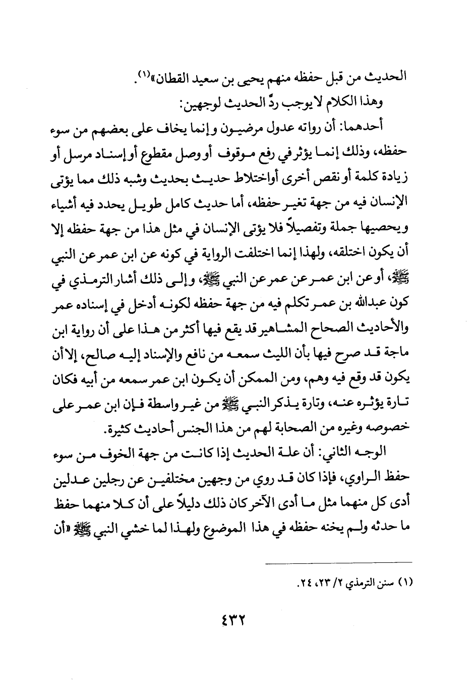 أحدهما: أن رواته عدول مرضيون وإنما يخاف على بعضهم من سوء حفظه وذلك إنما يؤثر في رفع موقوف أو وصل مقطوع أو اسناد مرسل أو زيادة كلمة أو نقضصاخرى أو اختلاط حديث بحديث وشبه ذلك مما يؤتى الإنسان فيه من جهة تغير حفظه أما حديث كامل طويل يحدد فيه أشياء ويحصيها جملة وتفصيلا فلا يؤتى الإنسان في مثل هذا من جهة حفظه إلا أن يكون اختلقه ولهذا إنما اختلفت الرواية في كونه عن ابن عمر عن النبي صلى الله عليه وسلم أو عن ابن عمر عن عمر عن النبي صلى الله عليه وسلم وإلى ذلك أشار الترمذي في كون عبد الله بن عمر تكلم فيه من جهة حفظه لكونه ادخل في اسناده عمر والأحاديث الصحاح المشاهير قد يقع فيها أكثر من هذا على أن رواية ابن ماجه قد صرح فيها بان الليث سمعه من نافع والاسناد إليه صالح إلا أن يكون قد وقع فيه وهم ومن الممكن أن يكون ابن عمر سمعه من ابيه فكان تارة يؤثره عنه وتارة يذكر النبي صلى الله عليه وسلم من غير واسطة فإن ابن عمر على خصوصه وغيره من الصحابة لهم من هذا الجنس أحاديث كثيرة.