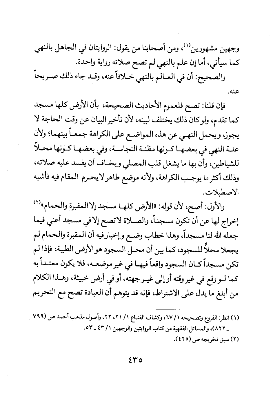والأول أصح لأن قوله الأرض كلها مسجد إلا المقبرة والحمام إخراج لها عن أن تكون مسجدا والصلاة لا تصح إلا في مسجد اعني فيما جعله الله لنا مسجدا وهذا خطاب وضع واخبار فيه أن المقبرة والحمام لم يجعلا مسجدا ومحلا للسجود كما بين أن محل السجود هو الأرض الطيبة فإذا لم تكن مسجدا كان السجود واقعا فيها في غير موضعه فلا يكون معتدا به كما لو وقع في غير وقته أو إلى غير جهته أو في أرض خبيثة وهذا الكلام من ابلغ ما يدل على الاشتراط فإنه قد يتوهم أن العبادة تصح مع التحريم