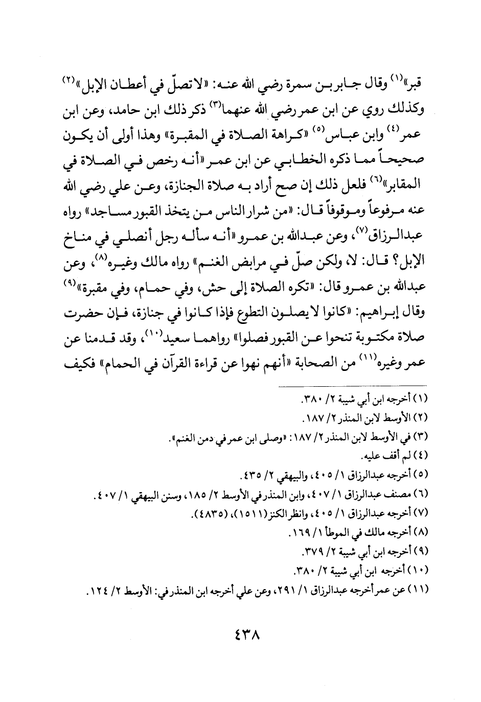 قبر وقال جابر بن سمرة رضي الله عنه: "لا تصل في أعطان الإبل" وكذلك روي عن ابن عمر رضي الله عنهما ذكر ذلك ابن حامد وعن ابن عمر وابن عباس كراهة الصلاة في المقبرة وهذا أولى أن يكون صحيحا مما ذكره الخطابي عن ابن عمر أنه: "رخص في الصلاة في المقابر" فلعل ذلك أن صح أراد به صلاة الجنازة وعن علي رضي الله عنه مرفوعا وموقوفا قال: "من شرار الناس من يتخذ القبور مساجد" رواه عبد الرزاق وعن عبد الله بن عمرو أنه سأله رجل انصلي في مناخ الإبل قال: "لا ولكن صل في مرابض الغنم" رواه مالك وغيره وعن عبد الله بن عمرو قال: "تكره الصلاة إلى حش وفي حمام وفي مقبرة" وقال إبراهيم: "كانوا لا يصلون التطوع فإذا كانوا في جنازة فإن حضرت صلاة مكتوبة تنحوا عن القبور فصلوا" رواهما سعيد وقد قدمنا عن عمر وغيره من الصحابة أنهم نهوا عن قراءة القران في الحمام" فكيف