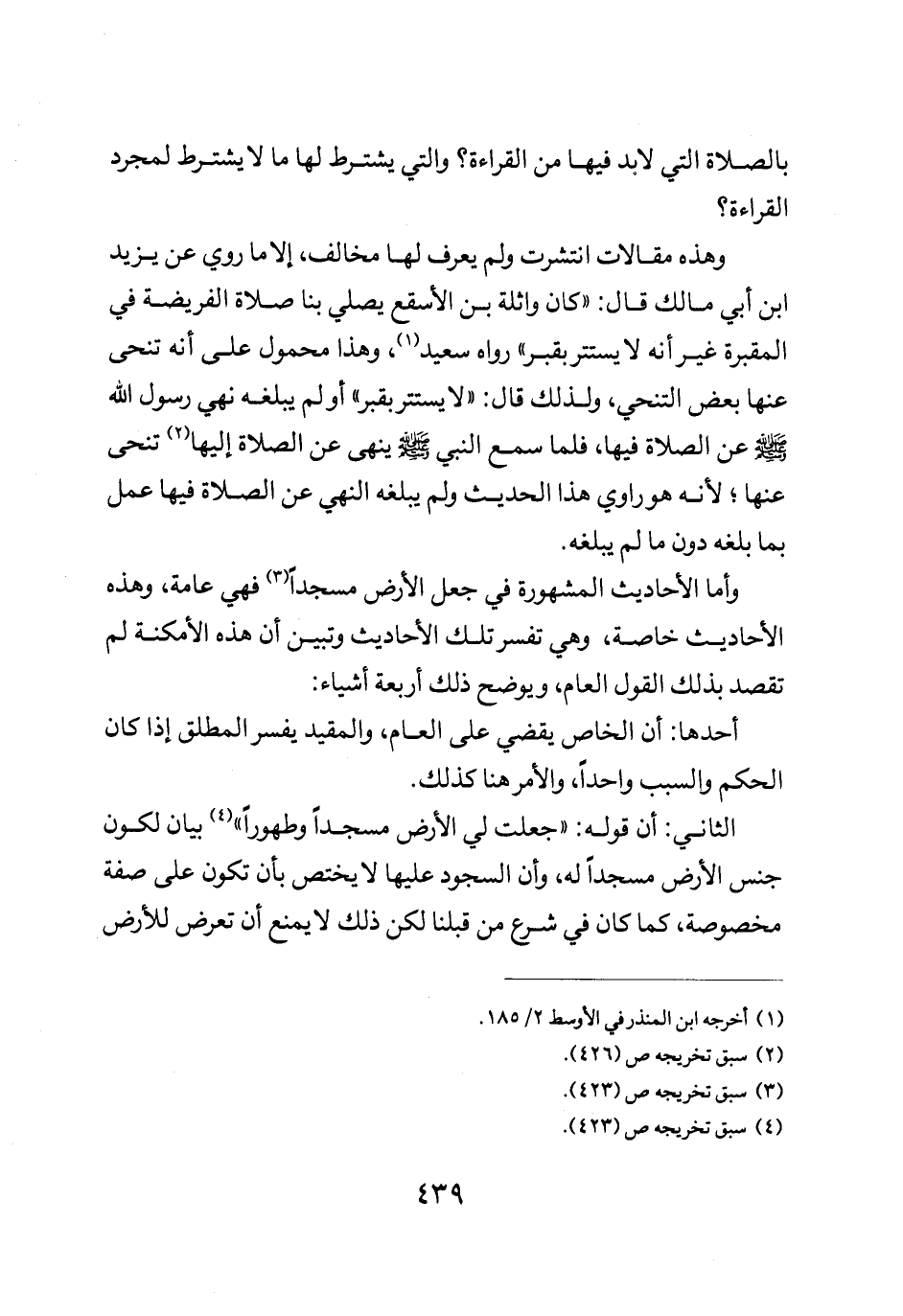 وأما الأحاديث المشهورة في جعل الأرض مسجدا فهي عامة وهذه الأحاديث خاصة وهي تفسر تلك الأحاديث وتبين أن هذه الأمكنة لم تقصد بذلك القول العام ويوضح ذلك أربعة أشياء.
