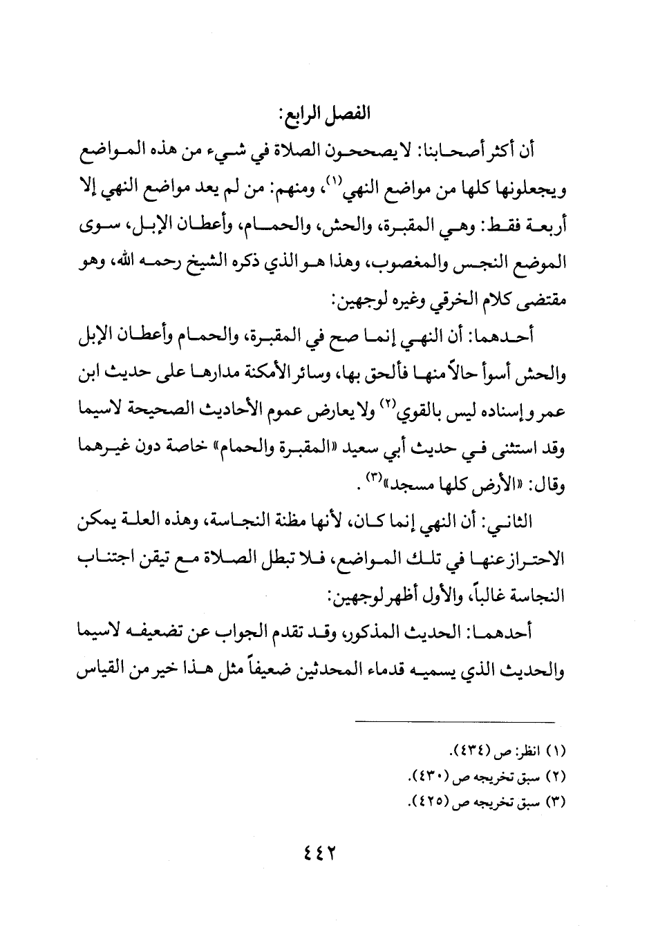 أن أكثر أصحابنا لا يصححون الصلاة في شيء من هذه المواضع ويجعلونها كلها من مواضع النهي ومنهم من لم يعد مواضع النهي إلا أربعة فقط وهي المقبرة والحش والحمام وأعطان الإبل سوى الموضع النجس والمغصوب وهذا هو الذي ذكره الشيخ رحمه الله وهو مقتضى كلام الخرقي وغيره لوجهين.