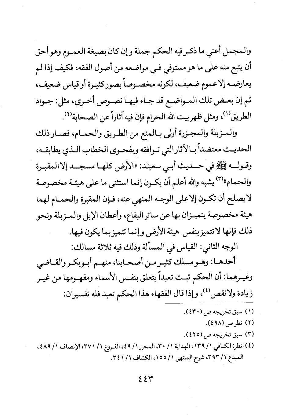 والمجمل اعني ما ذكر فيه الحكم جملة وأن كان بصيغة العموم وهو احق أن يتبع منه على ما هو مستوفي في مواضعه من اصول الفقه فكيف إذا لم يعارضه إلا عموم ضعيف لكونه مخصوصا بصور كثيرة أو قياس ضعيف ثم أن بعض تلك المواضع قد جاء فيها نصوص اخرى مثل جواد الطريق ومثل ظهر بيت الله الحرام فإن فيه اثارا عن الصحابة.