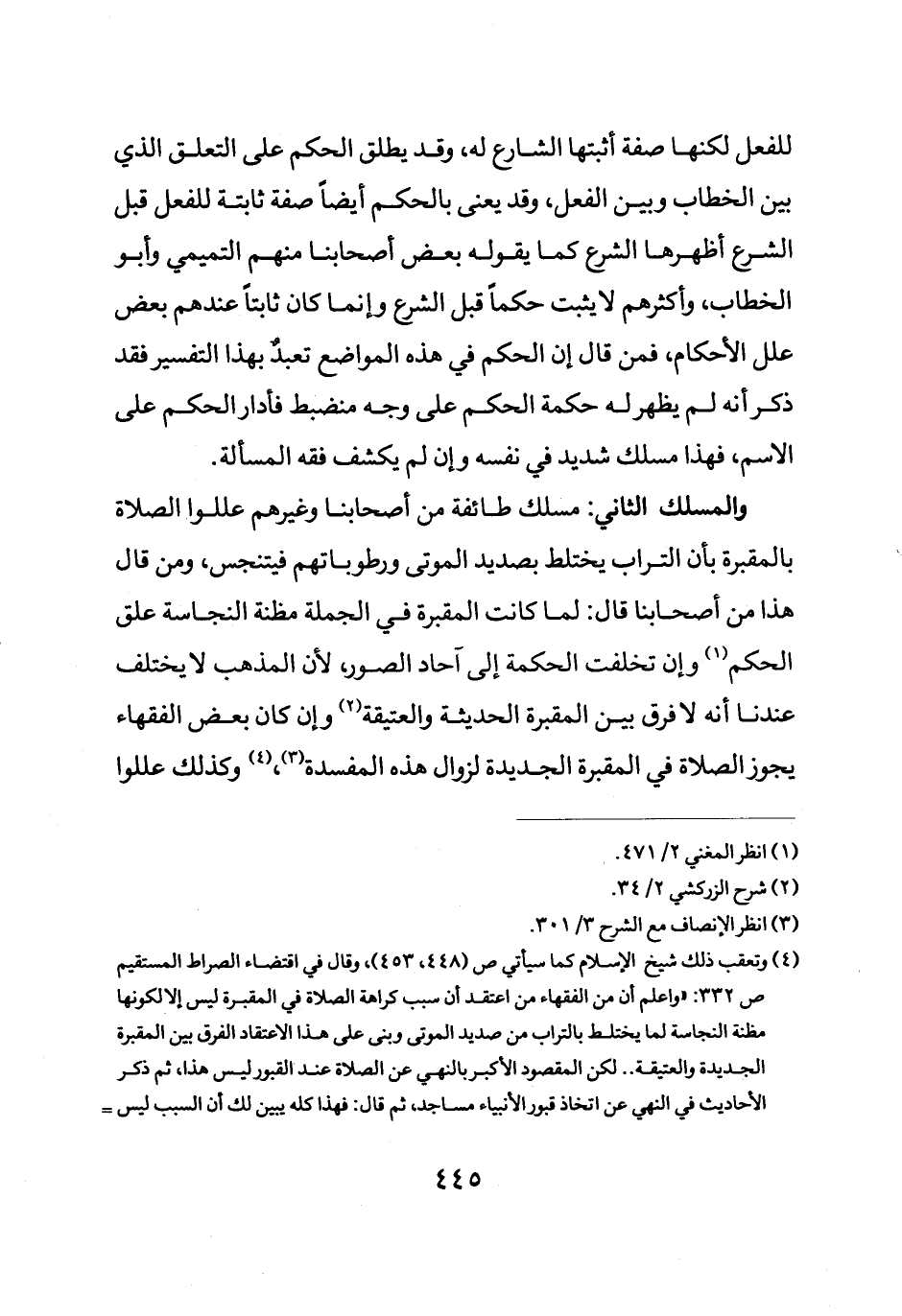 والمسلك الثاني: مسلك طائفة من أصحابنا وغيرهم عللوا الصلاة بالمقبرة بان التراب يختلط بصديد الموتى ورطوباتهم فيتنجس ومن قال هذا من أصحابنا قال لما كانت المقبرة في الجملة مظنة النجاسة علق الحكم وأن تخلفت الحكمة إلى احاد الصور لأن المذهب لا يختلف عندنا أنه لا فرق بين المقبرة الحديثة والعتيقة وأن كان بعض الفقهاء يجوز الصلاة في المقبرة الجديدة لزوال هذه المفسدة وكذلك عللوا