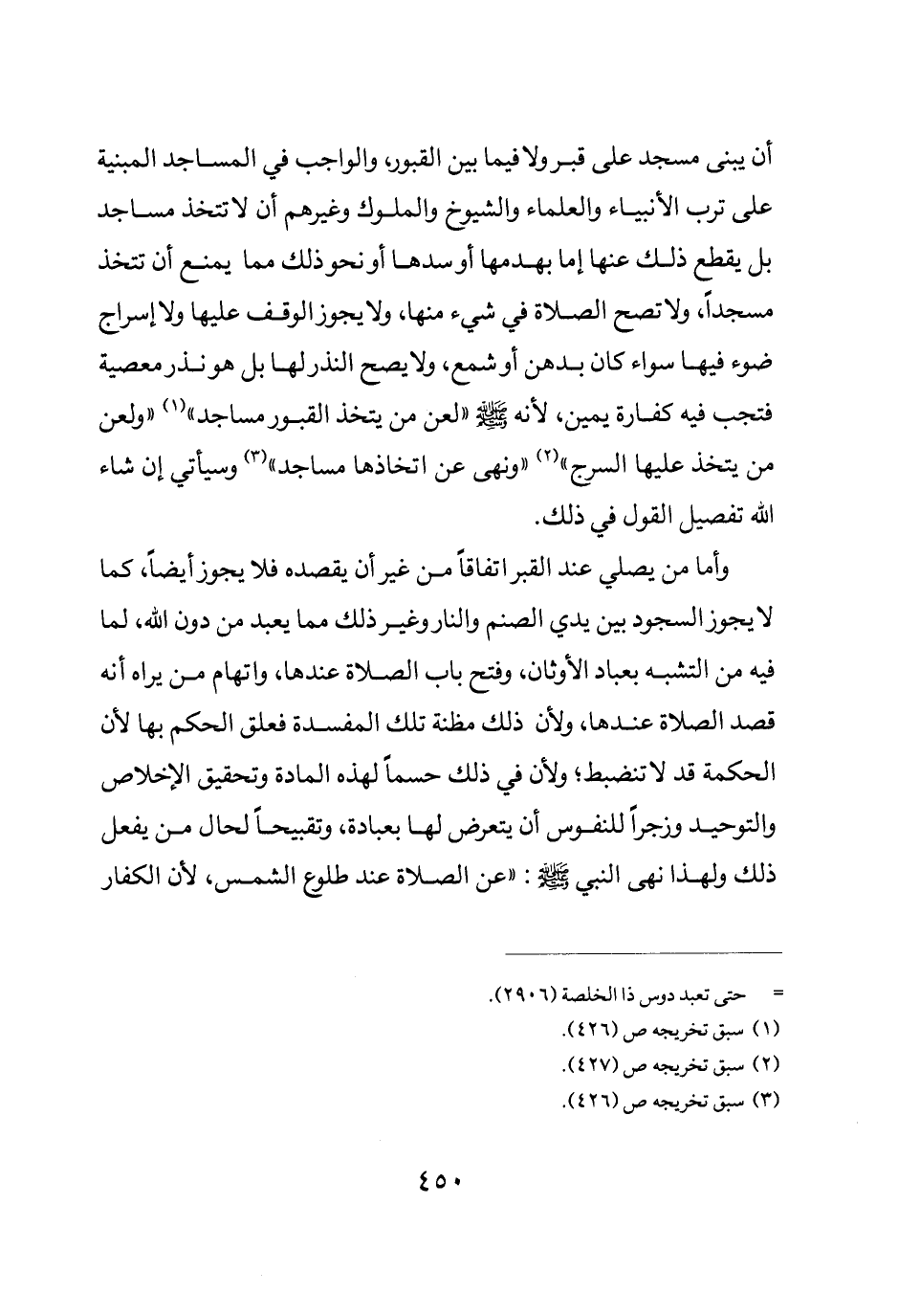 أن يبنى مسجد على قبر ولا فيما بين القبور والواجب في المساجد المبنية على ترب الأنبياء والعلماء والشيوخ والملوك وغيرهم أن لا تتخذ مساجد بل يقطع ذلك عنها أما بهدمها أو سدها أو نحو ذلك مما يمنع أن تتخذ مسجدا ولا تصح الصلاة في شيء منها ولا يجوز الوقف عليها ولا اسراج ضوء فيها سواء كان بدهن أو شمع ولا يصح النذر لها بل هو نذر معصية فتجب فيه كفارة يمين لأنه صلى الله عليه وسلم لعن من يتخذ القبور مساجد ولعن من يتخذ عليها السرج ونهى عن اتخاذها مساجد وسيأتي أن شاء الله تعالى تفصيل القول في ذلك.