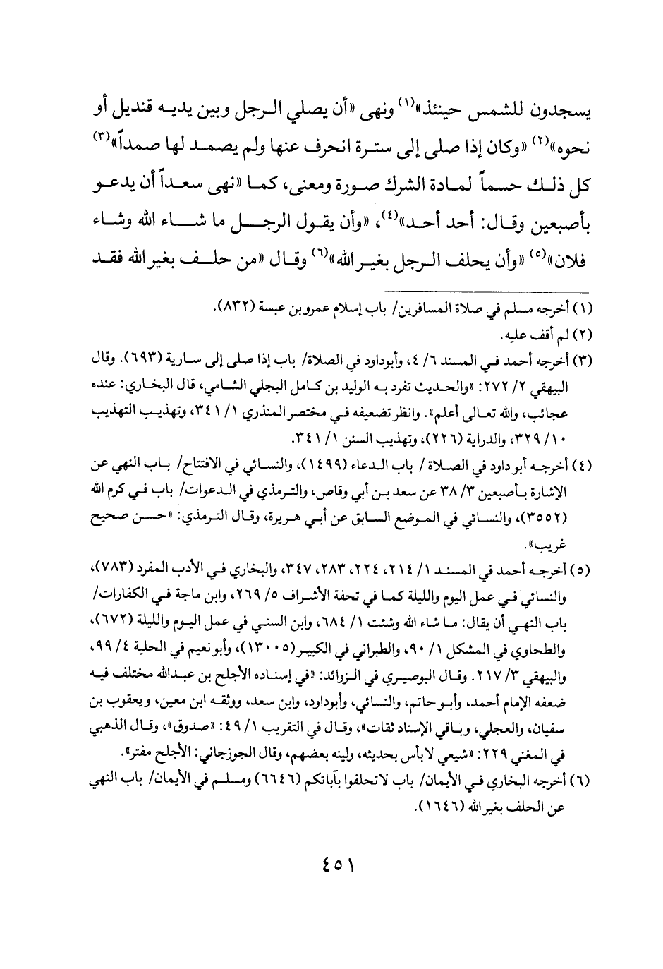 يسجدون للشمس حينئذ ونهى أن يصلي الرجل وبين يديه قنديل أو نحوه وكان إذا صلى إلى سترة انحرف عنها ولم يصمد لها صمدا كل ذلك حسما لمادة الشرك صورة ومعنى كما نهى سعدا أن يدعو باصبعين وقال أحد أحد وأن يقول الرجل ما شاء الله وشاء فلان وأن يحلف الرجل بغير الله وقال: "من حلف بغير الله فقد