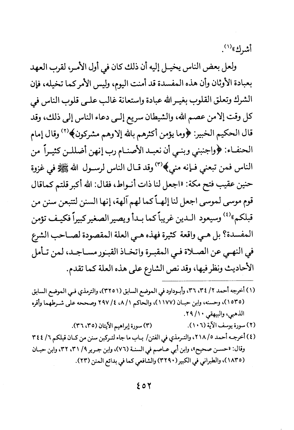 ولعل بعض الناس يخيل إليه أن ذلك كان في أول الأمر لقرب العهد بعبادة الأوثان وأن هذه المفسدة قد امنت اليوم وليس الأمر كما تخيله فإن الشرك وتعلق القلوب بغير الله عبادة واستعانة غالب على قلوب الناس في كل وقت إلا من عصم الله والشيطان سريع إلى دعاء الناس إلى ذلك وقد قال الحكيم الخبير {وَمَا يُؤْمِنُ أَكْثَرُهُمْ بِاللَّهِ إلا وَهُمْ مُشْرِكُونَ} وقال امام الحنفاء {وَاجْنُبْنِي وَبَنِيَّ أن نَعْبُدَ الأصنام رَبِّ إِنَّهُنَّ أَضْلَلْنَ كَثِيراً مِنَ النَّاسِ فَمَنْ تَبِعَنِي فإنه مِنِّي} وقد قال الناس لرسول الله صلى الله عليه وسلم في غزوة حنين عقيب فتح مكة اجعل لنا لنا ذات انواط فقال: "الله أكبر قلتم كما قال قوم موسى لموسى اجعل لنا الها كما لهم الهة أنها السنن لتتبعن سنن من قبلكم وسيعود الدين غريبا كما بدأ" ويصير الصغير كبيرا فكيف تؤمن المفسدة بل هي واقعة كثيرة فهذه هي العلة المقصودة لصاحب الشرع في النهي عن الصلاة في المقبرة واتخاذ القبور مساجد لمن تأمل الأحاديث ونظر فيها وقد نص الشارع على هذه العلة كما تقدم.