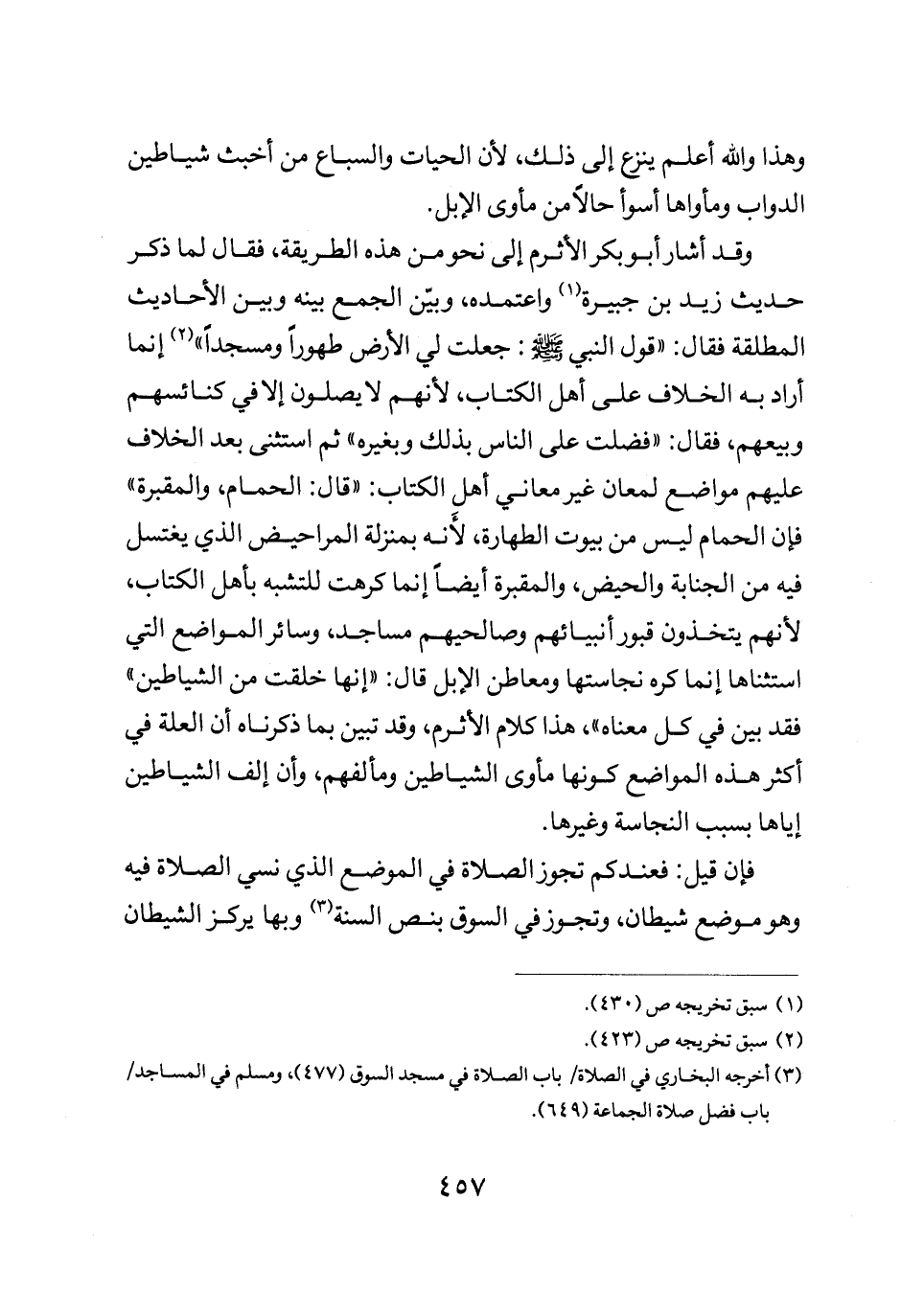 وقد أشار أبو بكر الأثرم إلى نحو من هذه الطريقة فقال لما ذكر حديث زيد بن جبيرة واعتمده وبين الجمع بينه وبين الأحاديث المطلقة فقال قول النبي صلى الله عليه وسلم: "جعلت لي الأرض طهورا ومسجدا" إنما أراد به الخلاف على أهل الكتاب لأنهم لا يصلون إلا في كنائسهم وبيعهم فقال فضلت على الناس بذلك وبغيره ثم استثنى بعد الخلاف عليهم مواضع لمعان غير معاني أهل الكتاب قال الحمام والمقبرة فإن الحمام ليس من بيوت الطهارة لأنه بمنزلة المراحيض الذي يغتسل فيه من الجنابة والحيض والمقبرة أيضا إنما كرهت للتشبه بأهل الكتاب لأنهم يتخذون قبور انبيائهم وصالحيهم مساجد وسائر المواضع التي استثناها إنما كره نجاستها ومعاطن الإبل قال أنها خلقت من الشياطين فقد بين في كل معناه هذا كلام الأثرم وقد تبين بما ذكرناه أن العلة في أكثر هذه المواضع كونها مأوى الشياطين ومألفهم وأن الف الشيطان اياها بسبب النجاسة وغيرها.