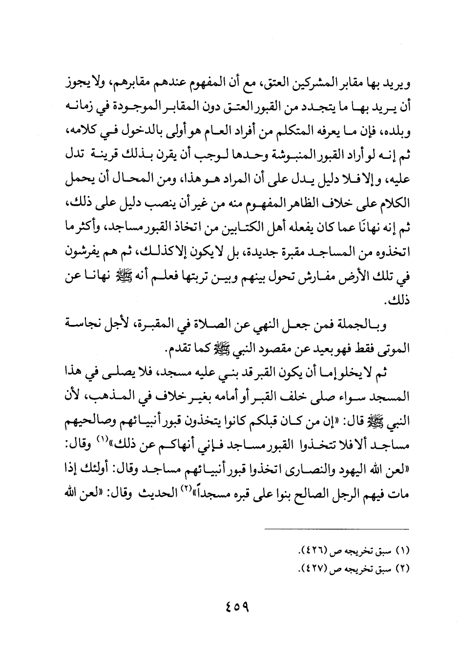 ويريد بها مقابر المشركين العتق مع أن المفهوم عندهم مقابرهم ولا يجوز أن يريد بها ما يتجدد من القبور دون المقابر الموجودة في زمانه وبلده فإن ما يعرفه المتكلم من افراد العام هو أولى بالدخول في كلامه ثم أنه لو أراد القبور المنبوشة وحدها لوجب أن يقرن بذلك قرينة تدل عليه والا فلا دليل يدل على أن المراد هو هذا ومن المحال أن يحمل الكلام على خلاف الظاهر المفهوم منه غير أن ينصب دليل على ذلك ثم أنه نهانا عما كان يفعله أهل الكتابين من اتخاذ القبور مساجد وأكثر ما اتخذوه من المساجد مقبرة جديدة بل لا يكون إلا كذلك ثم هم يفرشون في تلك الأرض مفارش تحول بينهم وبين تربتها فعلم أنه صلى الله عليه وسلم نهانا عن ذلك.