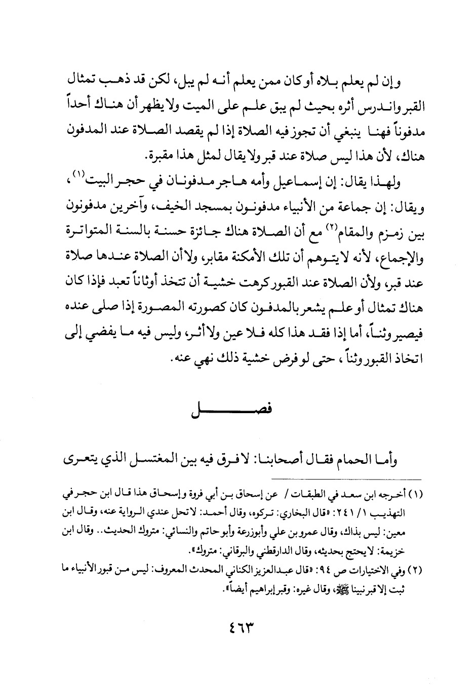 ولهذا يقال أن إسماعيل وامه هاجر مدفونان في حجر البيت ويقال أن جماعة من الأنبياء مدفونون بمسجد الخيف واخرين مدفونون بين زمزم والمقام مع أن الصلاة هناك جائزة حسنة بالسنة المتواترة والإجماع لأنه لا يتوهم أن تلك الأمكنة مقابر ولا أن الصلاة عندها صلاة عند قبر ولأن الصلاة عند القبور كرهت خشية أن تتخذ اوثانا تعبد فإذا كان هناك تمثال أو علم يشعر بالمدفون كان كصورته المصورة إذا صلى عنده فيصير وثنا أما إذا فقد هذا كله فلا عين ولا أثر وليس فيه ما يفضي إلى اتخاذ القبور وثنا حتى لو فرض خشية ذلك نهي عنه.
