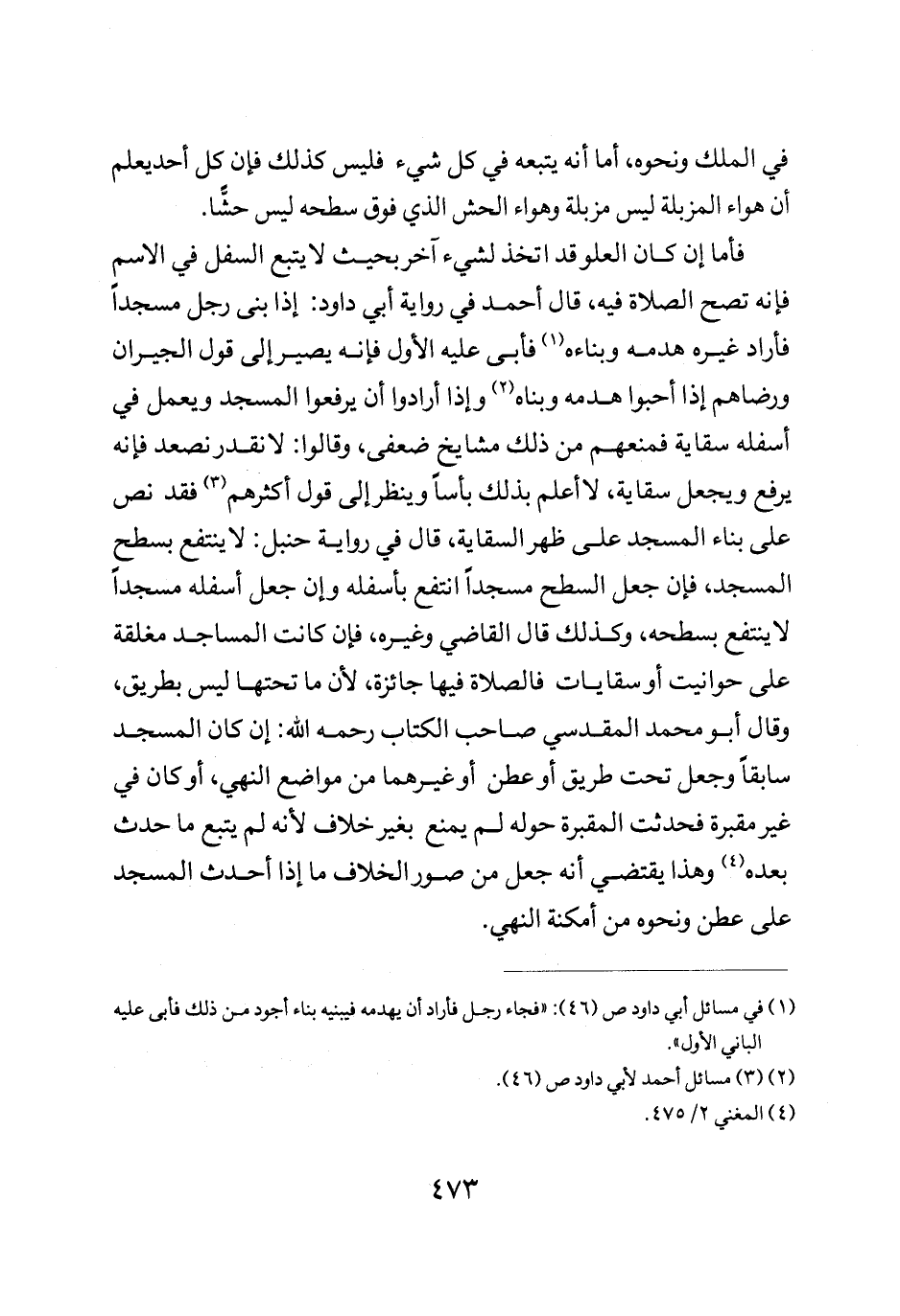 فأما أن كان العلو قد اتخذ لشيء اخر بحيث لا يتبع السفل في الاسم فإنه تصح الصلاة فيه قال أحمد في رواية أبي داود إذا بنى رجل مسجدا فاراد غيره هدمه وبناءه فابى عليه الأول فإنه يصير إلى قول الجيران ورضاهم إذا احبوا هدمه وبناه وإذا ارادوا أن يرفعوا المسجد ويعمل في اسفله سقاية فمنعهم من ذلك مشايخ ضعفى وقالوا لا نقدر نصعد فإنه يرفع ويجعل سقاية لا أعلم بذلك بأسا وينظر إلى قول أكثرهم فقد نص على بناء المسجد على ظهر السقاية قال في رواية حنبل لا ينتفع بسطح المسجد فإن جعل السطح مسجدا انتفع بأسفله وأن جعل اسفله مسجدا لا ينتفع بسطحه وكذلك قال القاضي وغيره فإن كانت المساجد مغلقة على حوانيت أو سقاييات فالصلاة فيها جائزة لأن ما تحتها ليس بطريق وقال أبو محمد المقدسي صاحب الكتاب رحمه الله أن كان المسجد سابقا وجعل تحت طريق أو عطن أو غيرهما من مواضع النهي أو كان في غير مقبرة فحدثت المقبرة حوله لم يمنع بغير خلاف لأنه لم يتبع ما حدث بعده وهذا يقتضي أنه جعل من صور الخلاف ما إذا احدث المسجد على عطن ونحوه من أمكنة النهي.