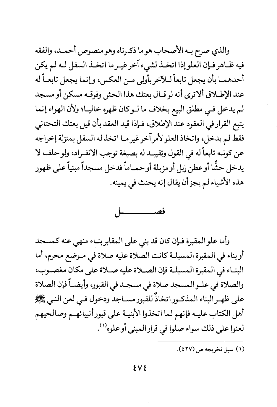 وأما علو المقبرة فإن كان قد بني على المقابر بناء منهي عنه كالمسجد أو بناء في المقبرة المسبلة كانت الصلاة عليه صلاة في موضع محرم أما البناء في المقبرة المسبلة فإن الصلاة عليه صلاة على مكان مغصوب والصلاة في علو المسجد صلاة في مسجد في القبور وأيضا فإن الصلاة على ظهر البناء المذكور اتخاذ للقبور مساجد ودخول في لعن النبي صلى الله عليه وسلم أهل الكتاب عليه فانهم لما اتخذوا الابنية على قبور انبيائهم وصالحيهم لعنوا على ذلك سواء صلوا في قرار المبنى أو علوه.