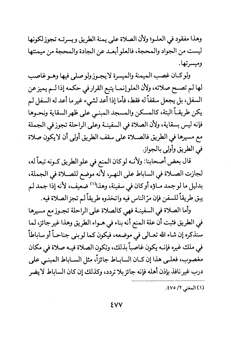 وأما الصلاة في السفينة فهي كالصلاة على الراحلة تجوز مع مسيرها في الطريق فثبت أن علة المنع أنه بناء في هواء الطريق وهذا غير جائز لما سنذكره أن شاء الله تعالى في موضعه فيكون كما لو بنى جناحا أو ساباطا في ملك غيره فإنه يكون غاصبا بذلك وتكون الصلاة فيه صلاة في مكان مغصوب فعلى هذا أن كان الساباط جائزا مثل الساباط المبني على درب غير نافذ باذن اهله فإنه جائز بلا تردد وكذلك أن كان الساباط لا يضر