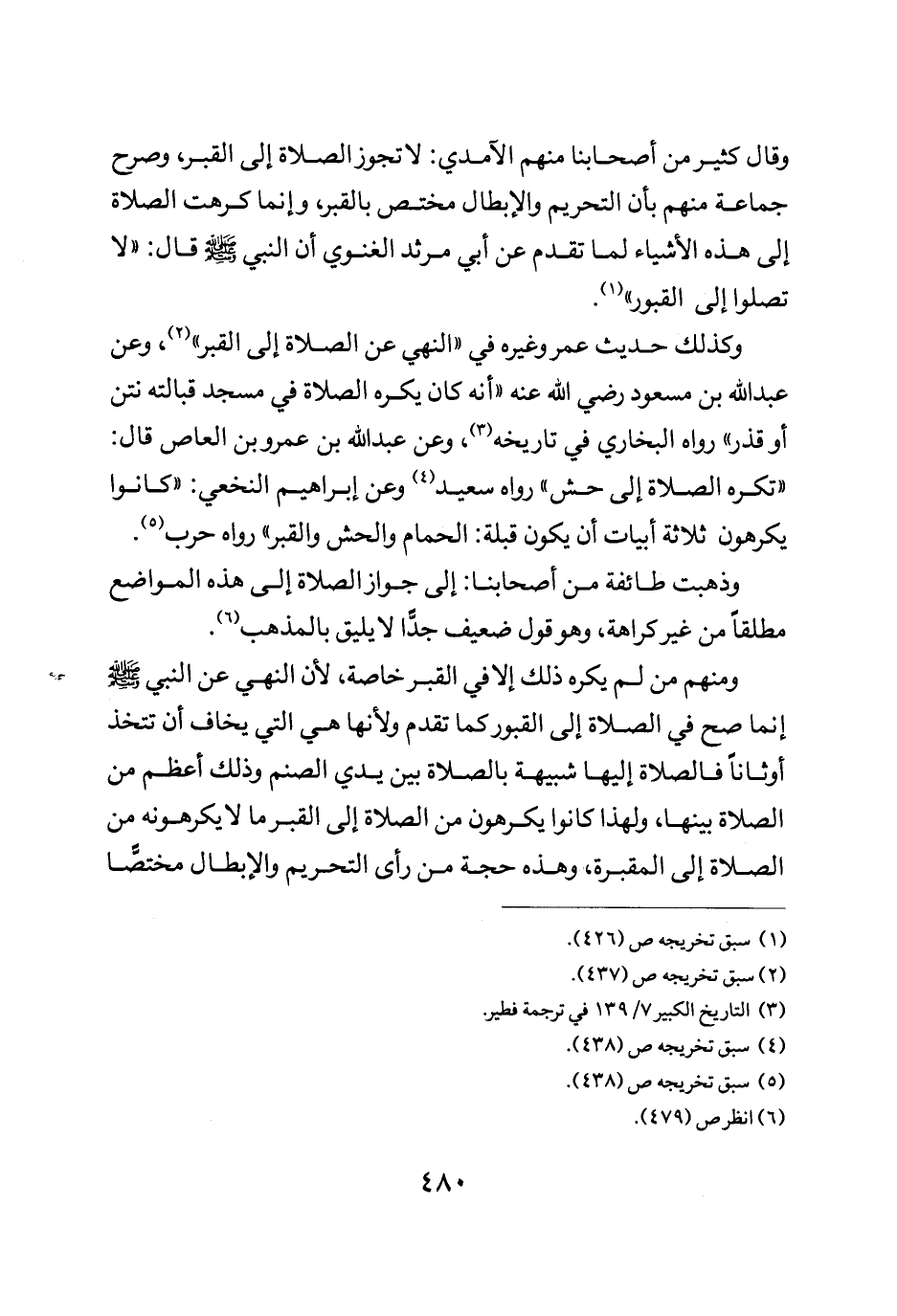ومنهم من لم يكره ذلك إلا في القبر خاصة لأن النهي عن النبي صلى الله عليه وسلم إنما صح في الصلاة إلى القبور كما تقدم ولأنها هي التي يخاف أن تتخذ اوثانا فالصلاة إليها شبيهة بالصلاة بين يدي صنم وذلك أعظم من الصلاة بينها ولهذا كانوا يكرهون من الصلاة إلى القبر ما لا يكرهونه من الصلاة إلى المقبرة وهذه حجة من رأى التحريم والإبطال مختصا