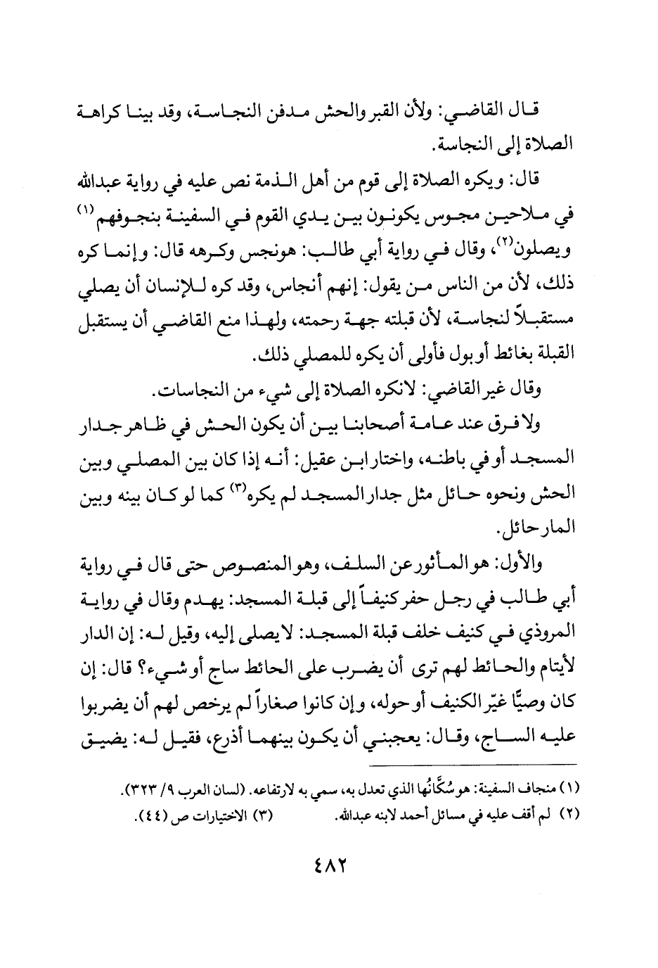 قال ويكره الصلاة إلى قوم من أهل الذمة نص عليه في رواية عبد الله في ملاحين مجوس يكونون بين يدي القوم في السفينة بنجوفهم ويصلون وقال في رواية أبي طالب هو نجس وكرهه قال وإنما كره ذلك لأن من الناس من يقول أنهم انجاس وقد كره للانسان أن يصلي مستقبلا لنجاسة لأن قبلته جهة رحمته ولهذا منع القاضي أن يستقبل القبلة بغائط أو بول فأولى أن يكره للمصلي ذلك.