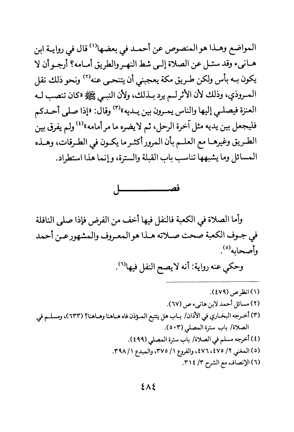 المواضع وهذا هو المنصوص عن أحمد في بعضها قال في رواية ابن هانىء وقد سئل عن الصلاة إلى شط النهر والطريق امامه ارجو أن لا يكون به بأس ولكن طريق مكة يعجبني أن يتنحى عنه ونحو ذلك نقل المروذي وذلك لأن الاثر لم يرد بذلك ولأن النبي صلى الله عليه وسلم كان تنصب له العنزة فيصلي إليها والناس يمرون بين يديه وقال: "إذا صلى أحدكم فليجعل بين يديه مثل اخر الرحل ثم لا يضره ما مر امامه" ولم يفرق بين الطريق وغيرها مع العلم بان المرور أكثر ما يكون في الطرقات وهذه المسائل وما يشبهها تناسب باب القبلة والسترة وإنما هذا استطراد.