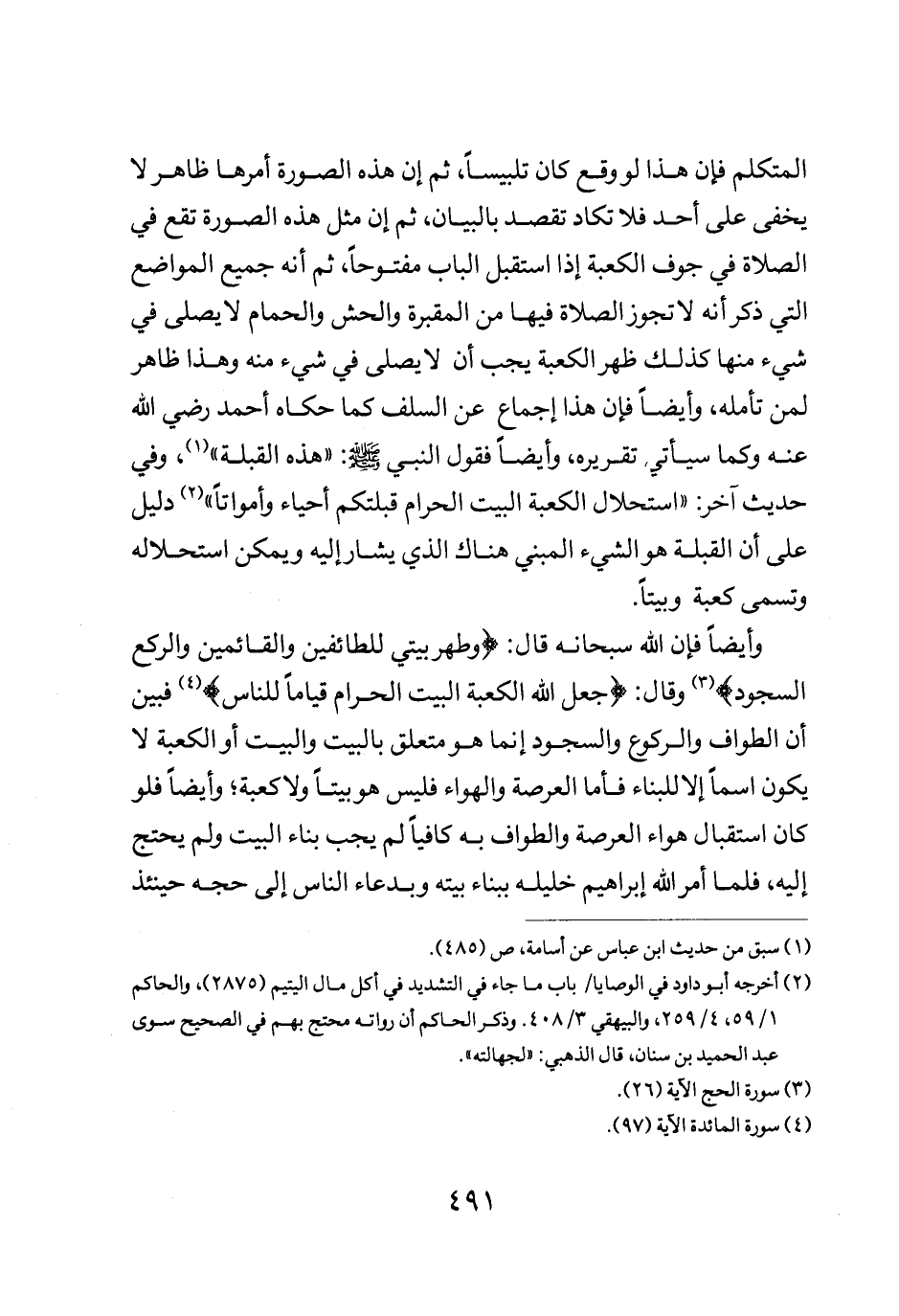 المتكلم فإن هذا لو وقع كان تلبيسا ثم أن هذه الصورة امرها ظاهر لا يخفى على أحد فلا تكاد تقصد بالبيان ثم أن مثل هذه الصورة تقع في الصلاة في جوف الكعبة إذا استقبل الباب مفتوحا ثم أنه جميع المواضع التي ذكر أنه لا تجوز الصلاة فيها من المقبرة والحش والحمام لا يصلي في شيء منها كذلك ظهر الكعبة يجب أن لا يصلى في شيء منه وهذا ظاهر لمن تامله وأيضا فإن هذا اجماع عن السلف كما حكاه أحمد رضي الله عنه وكما سيأتي تقريره وأيضا فقول النبي صلى الله عليه وسلم: "هذه القبلة" وفي حديث اخر استحلال الكعبة البيت الحرام قبلتكم أحياء وامواتا دليل على أن القبلة هو الشيء المبني هناك الذي يشار إليه ويمكن استحلاله وتسمى كعبة وبيتا.