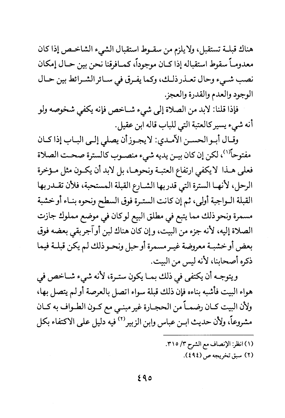 وقال أبو الحسن الآمدي لا يجوز أن يصلي إلى الباب إذا كان إذا كان مفتوحا لكن أن كان بين يديه شيء منصوب كالسترة صحت الصلاة فعلى هذا لا يكفي ارتفاع العتبة ونحوها بل لا بد أن يكون مثل مؤخرة الرحل لأنها السترة التي قدر بها الشارع القبلة المستحبة فلان تقدر بها القبلة الواجبة أولى ثم أن كانت السترة فوق السطح ونحوه بناء أو خشبة مسمرة ونحو ذلك مما يتبع في مطلق البيع لو كان في موضع مملوك جازت الصلاة إليه لأنه جزء من البيت وأن كان هناك لبن أو اجر بقي بعضه فوق بعض أو خشبة معروضة غير مسمرة أو حبل ونحو ذلك لم يكن قبلة فيما ذكره أصحابنا لأنه ليس من البيت.