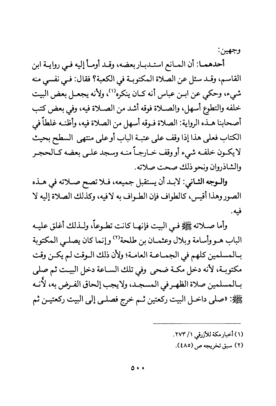 وأما صلاته صلى الله عليه وسلم في البيت فإنها كانت تطوعا ولذلك اغلق عليه الباب هو واسامة وبلال وعثمان بن طلحة وانما كان يصلي المكتوبة بالمسلمين كلهم في الجماعة العامة ولأن ذلك الوقت لم يكن وقت مكتوبة لأنه دخل مكة ضحى وفي تلك الساعة دخل البيت ثم صلى بالمسلمين صلاة الظهر في المسجد ولا يجب الحاق الفرض به لأنه صلى الله عليه وسلم صلى داخل البيت ركعتين ثم خرج فصلى إلى البيت ركعتين ثم