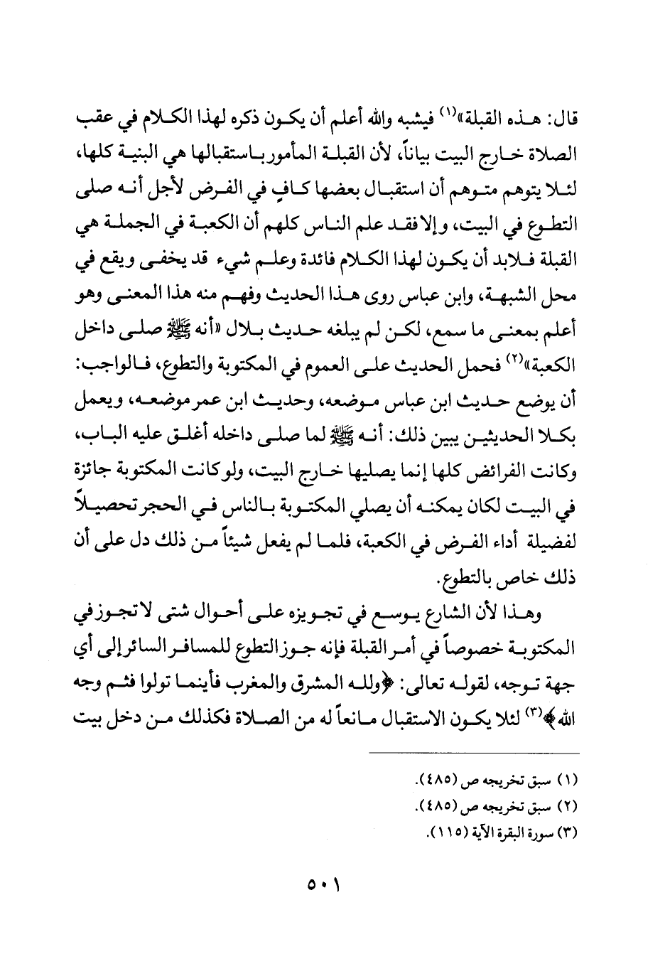 قال هذه القبلة فيشبه والله أعلم أن يكون ذكره لهذا الكلام في عقب الصلاة خارج البيت بيانا لأن القبلة المأمور باستقبالها هي البنية كلها لئلا يتوهم متوهم أن استقبال بعضها كاف في الفرض لاجل أنه صلى التطوع في البيت والا فقد علم الناس كلهم أن الكعبة في الجملة هي القبلة فلا بد أن يكون لهذا الكلام فائدة وعلم شيء قد يخفى ويقع في محل الشبهة وابن عباس روى هذا الحديث وفهم منه هذا المعنى وهو أعلم بما سمع لكن لم يبلغه حديث بلال أنه صلى الله عليه وسلم صلى داخل الكعبة فحمل الحديث على العموم في المكتوبة والتطوع فالواجب أن يوضع حديث ابن عباس موضعه وحديث ابن عمر موضعه ويعمل بكلا الحديثين يبين ذلك أنه صلى الله عليه وسلم لما صلى داخله أغلق عليه الباب وكانت الفرائض كلها إنما يصليها خارج البيت ولو كانت المكتوبة جائزة في البيت لكان يمكنه أن يصلي المكتوبة بالناس في الحجر تحصيلا لفضيلة اداء الفرض في الكعبة فلما لم يفعل شيئا من ذلك دل على أن ذلك خاص بالتطوع.