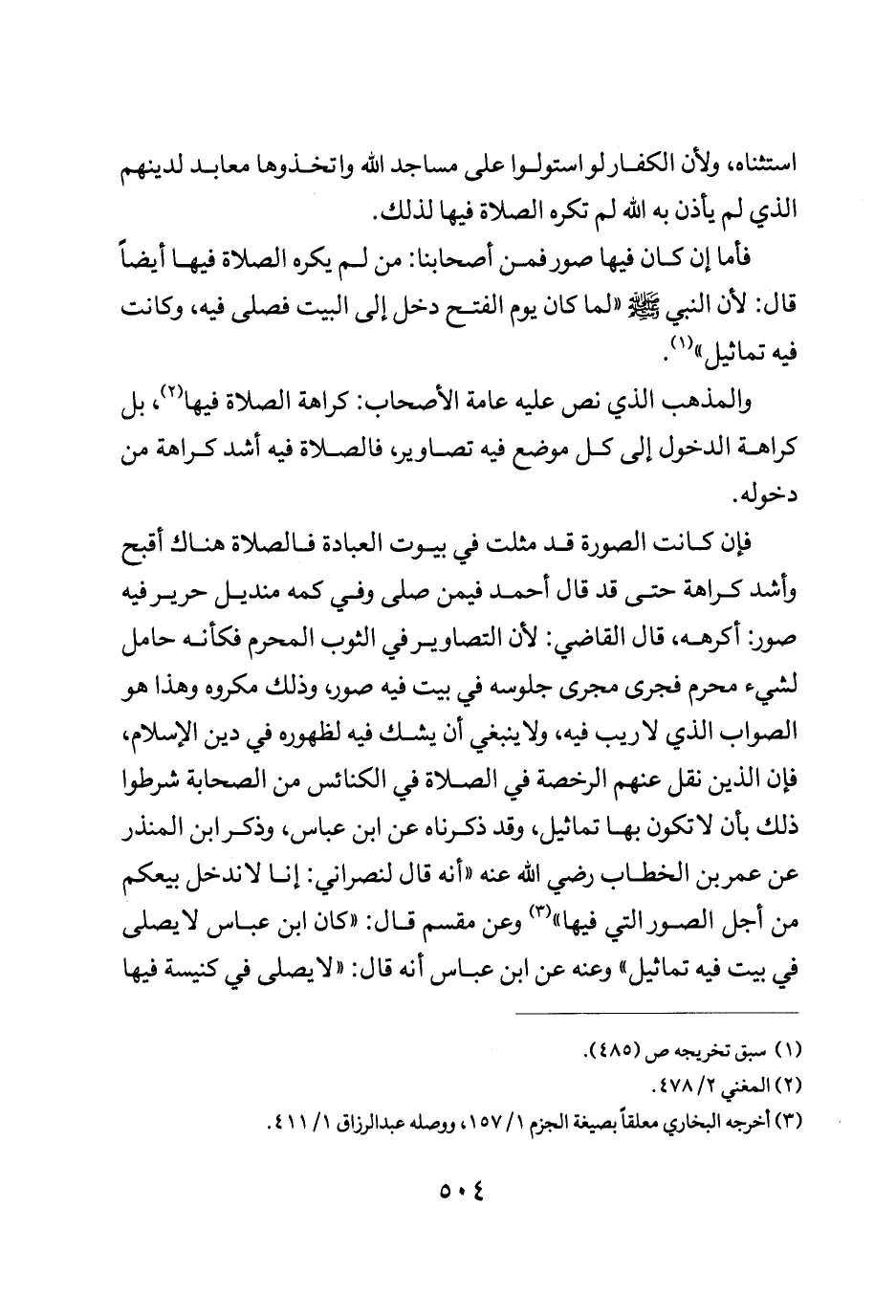 فان كانت الصورة قد مثلت في بيوت العبادة فالصلاة هناك اقبح وأشد كراهة حتى قد قال أحمد فيمن صلى وفي كمه منديل حرير فيه صور اكرهه قال القاضي لأن التصاوير في الثوب المحرم فكأنه حامل لشيء محرم فجرى مجرى جلوسه في بيت فيه صور وذلك مكروه وهذا هو الصواب الذي لا ريب فيه ولا ينبغي أن يشك فيه لظهوره في دين الاسلام فإن الذين نقل عنهم الرخصة في الصلاة في الكنائس من الصحابة شرطوا ذلك بأن لا تكون بها تماثيل وقد ذكرناه عن ابن عباس وذكر ابن المنذر عن عمر بن الخطاب رضي الله عنه أنه قال لنصراني انا لا ندخل بيعكم من أجل الصور التي فيها وعن مقسم قال: "كان ابن عباس لا يصلي في بيت فيه تماثيل" وعنه عن ابن عباس أنه: "قال لا يصلي فى كنيسة فيها