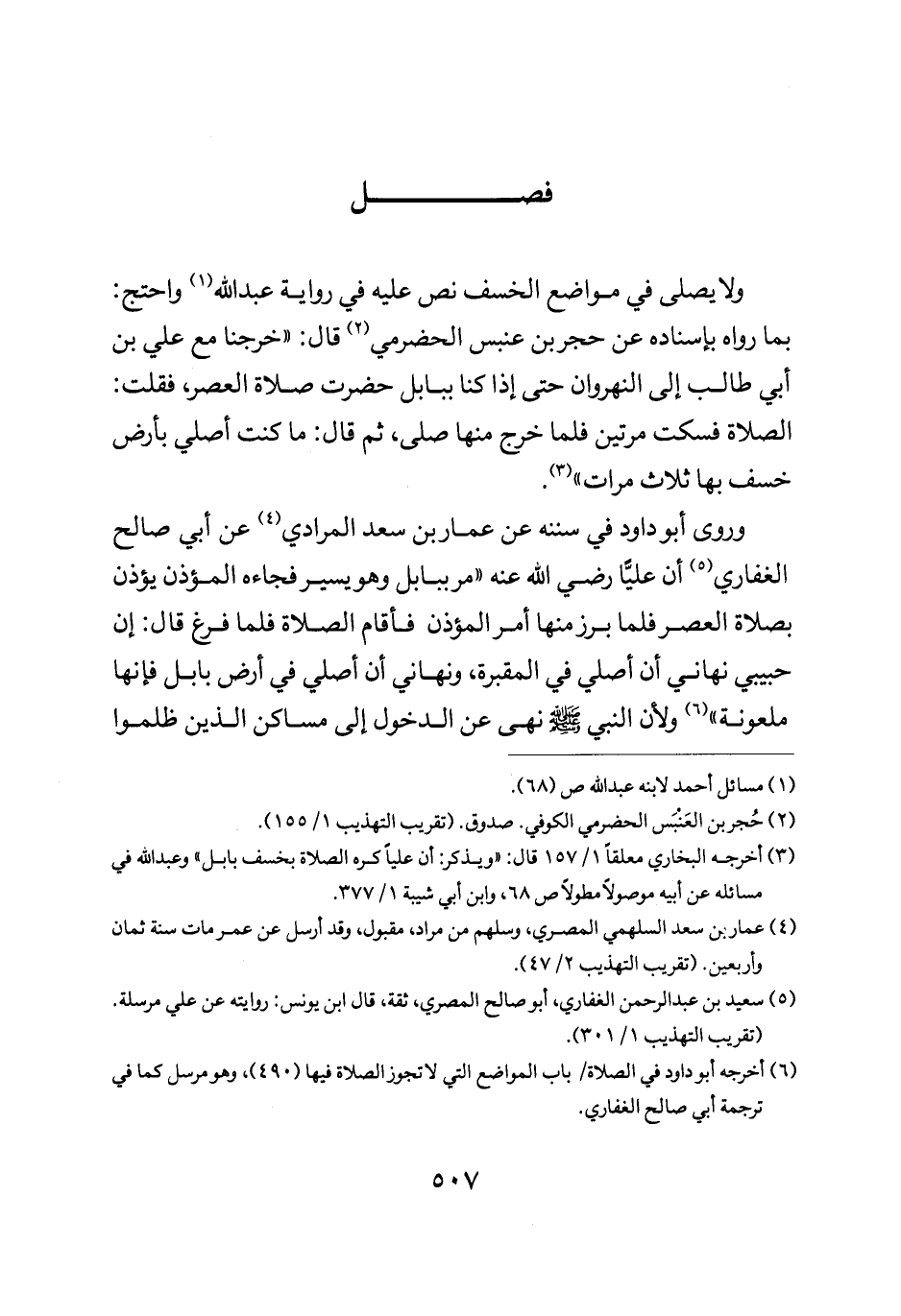 ولا يصلى في مواضع الخسف نص عليه في رواية عبد الله واحتج بما رواه بإسناده عن حجر بن عنبس الحضرمي قال خرجنا مع علي بن أبي طالب إلى النهروان حتى إذا كنا ببابل حضرت صلاة العصر فقلت الصلاة فسكت مرتين فلما خرج منها صلى ثم قال: "ما كنت اصلي بارض خسف بها ثلاث مرات".