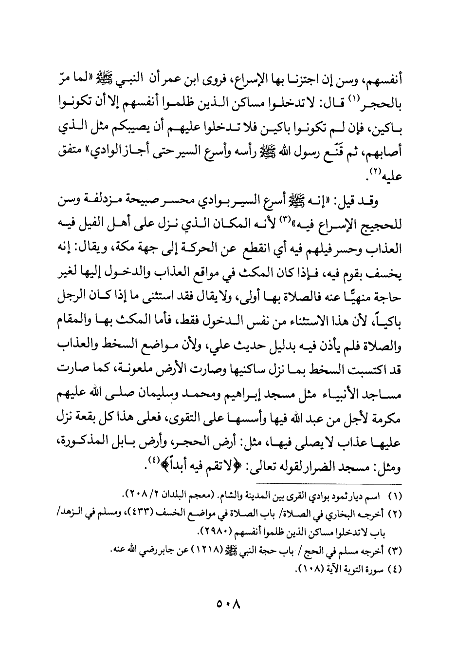 انفسهم وسن أن اجتزنا بها الاسراع" فروى ابن عمر أن النبي صلى الله عليه وسلم لما مر بالحجر قال: "لا تدخلوا مساكن الذين ظلموا انفسهم إلا أن تكونوا باكين فإن لم تكونوا باكين فلا تدخلوا عليهم أن يصيبكم مثل الذي أصابهم ثم قنع رسول الله صلى الله عليه وسلم راسه واسرع السير حتى أجاز الوادي" متفق عليه.